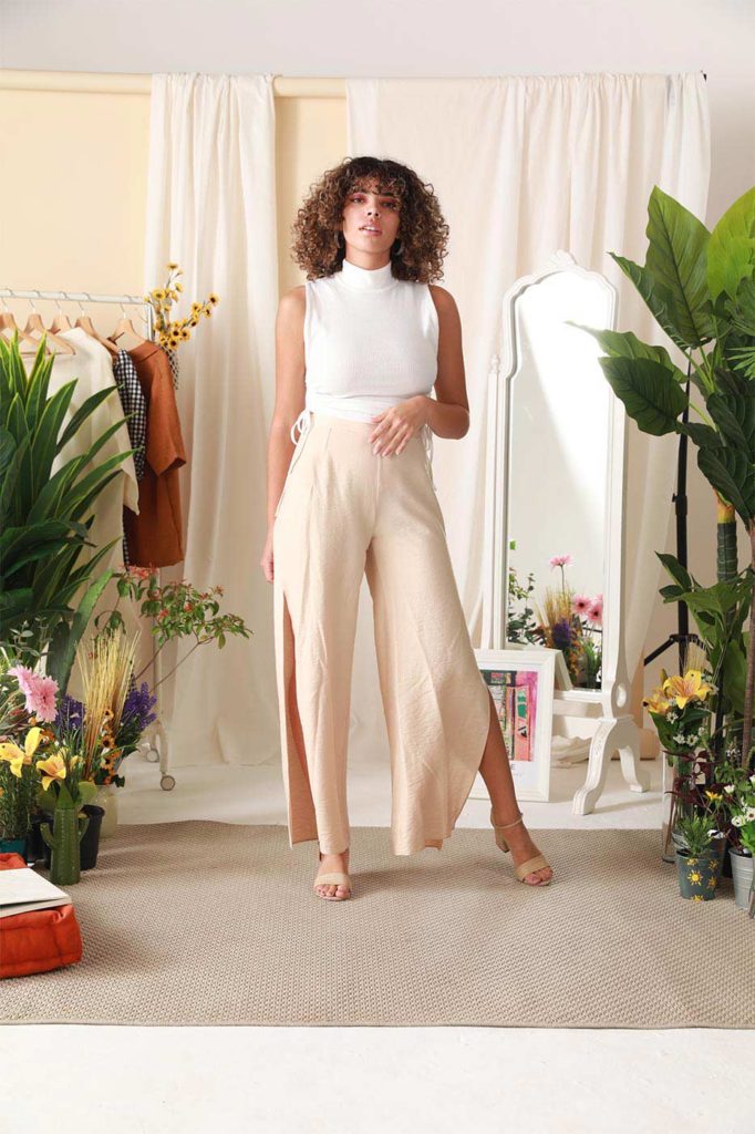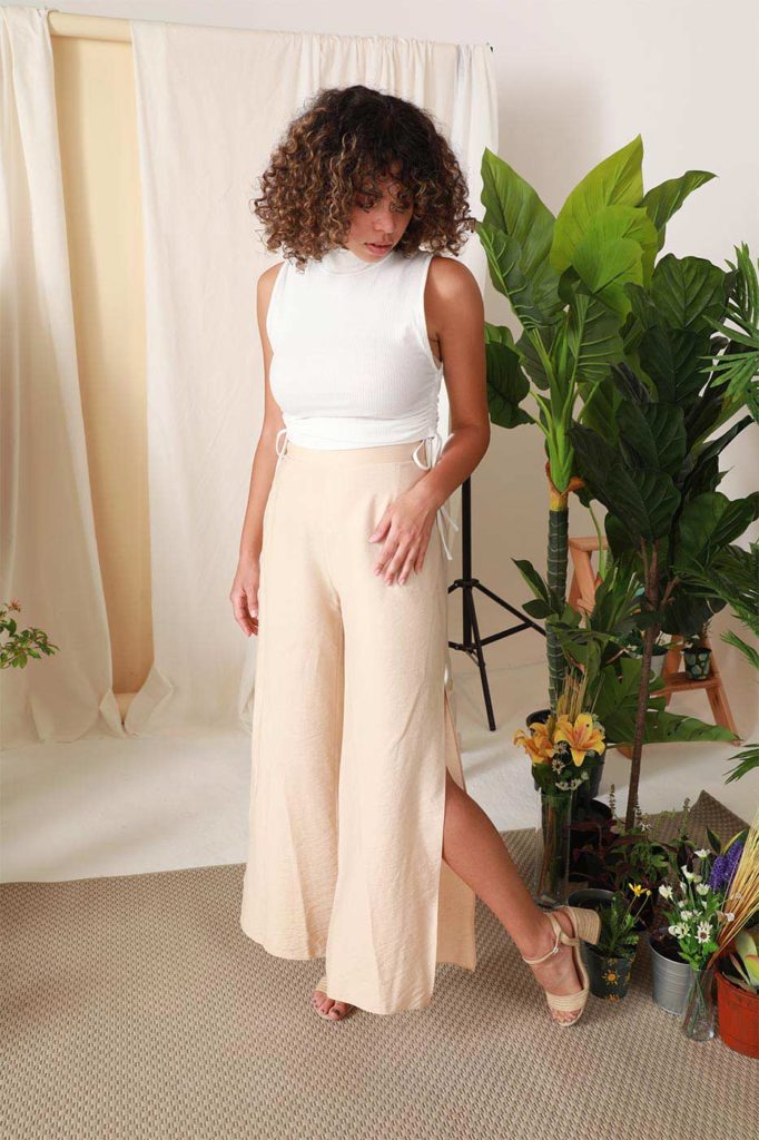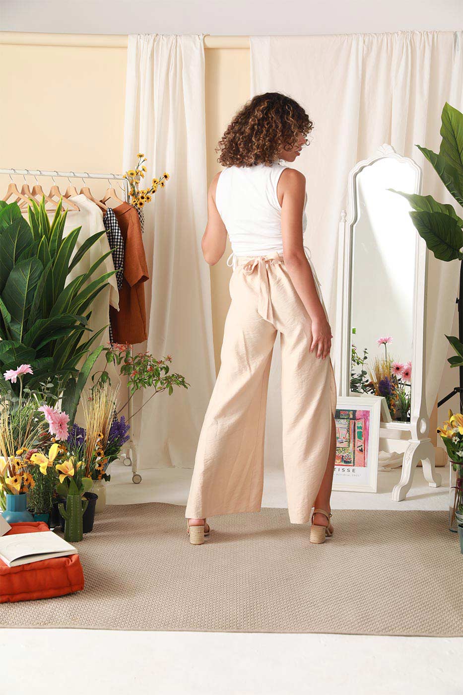 For your morning summer outtings go with our ' Minimalist ' pants . This linen pants features a wide waist band with waist tie and wide leg cut with side slits. Style it with your basic cropped top, put your sliders on and you are ready to go.Size Details