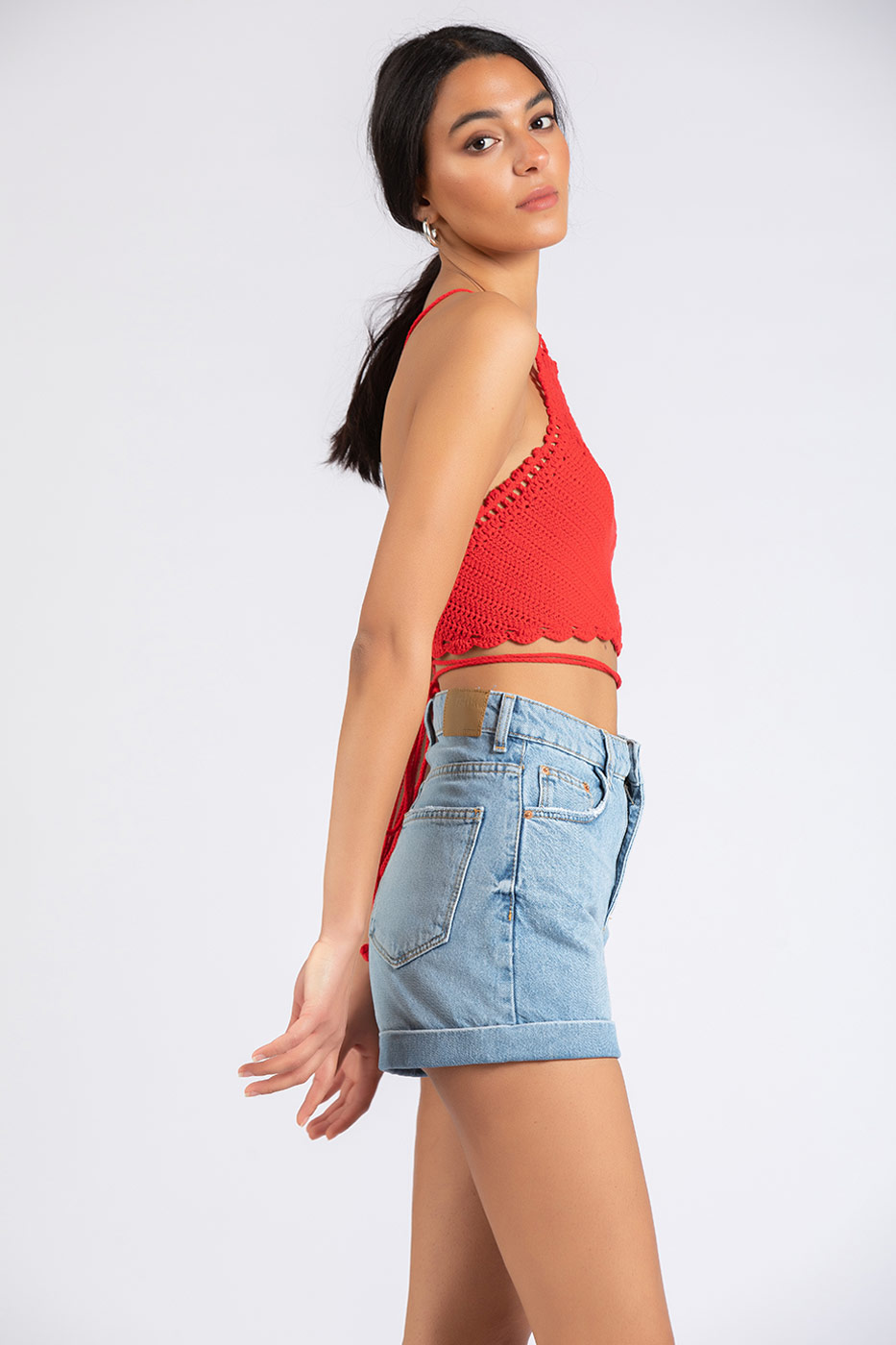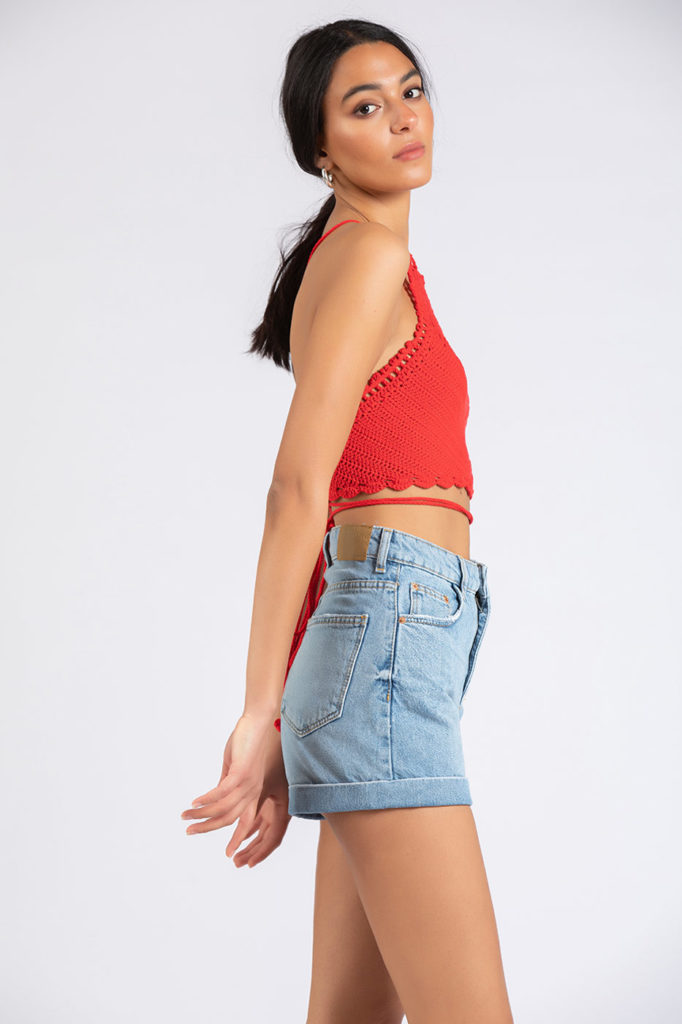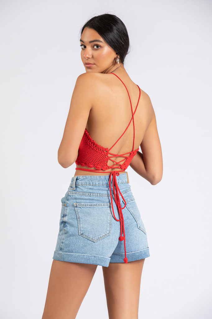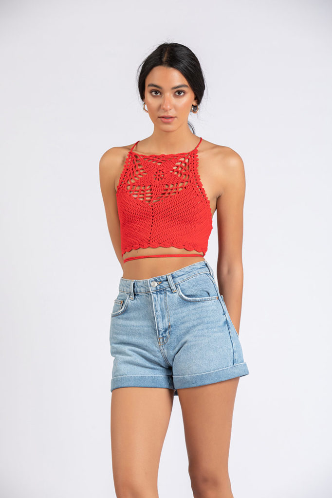 Change your regular style and be unique in this crochet design cropped top. It features a halter neck, crochet trims and tie details. Put your denim shorts on and you are ready to go!Size Details