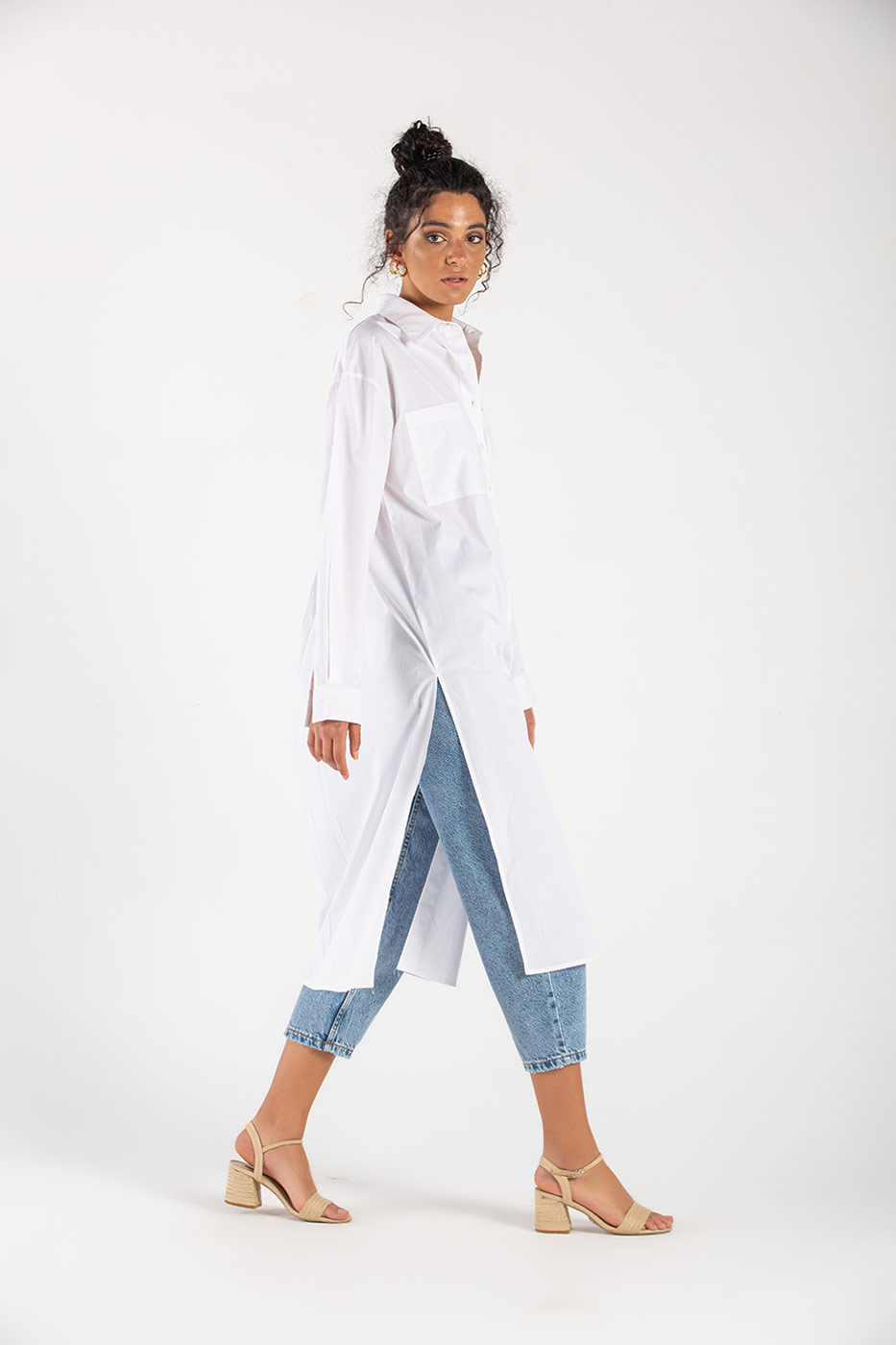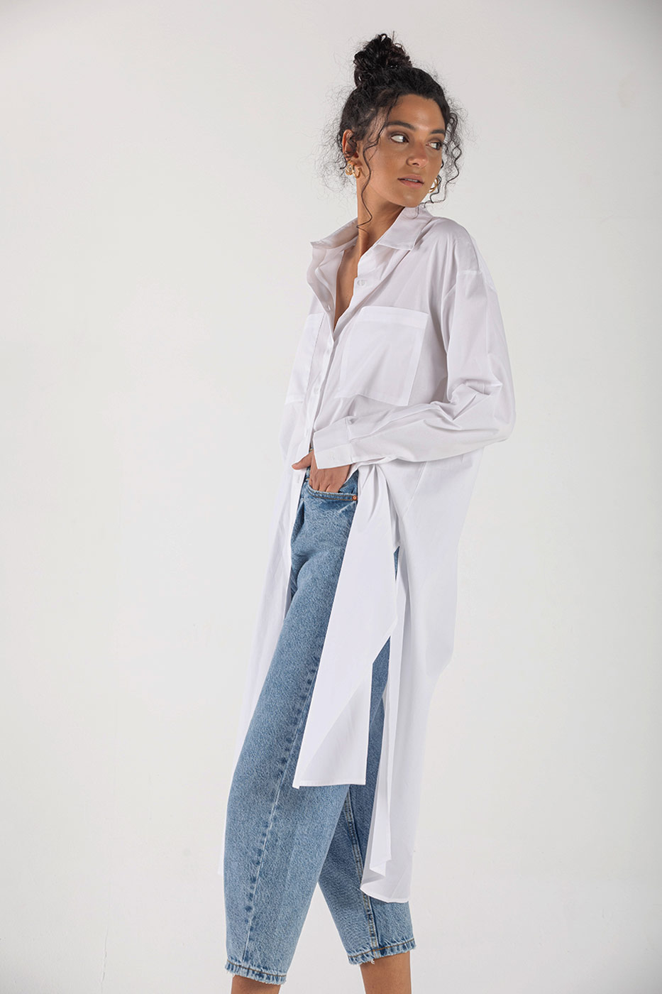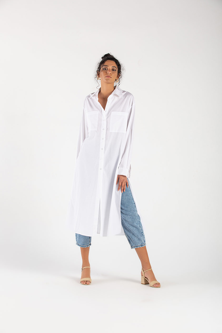 فستان بأكمام طويلة مع ربطة خصر مزين بجيوب أمامية و فتحات جانبية أنيقة .