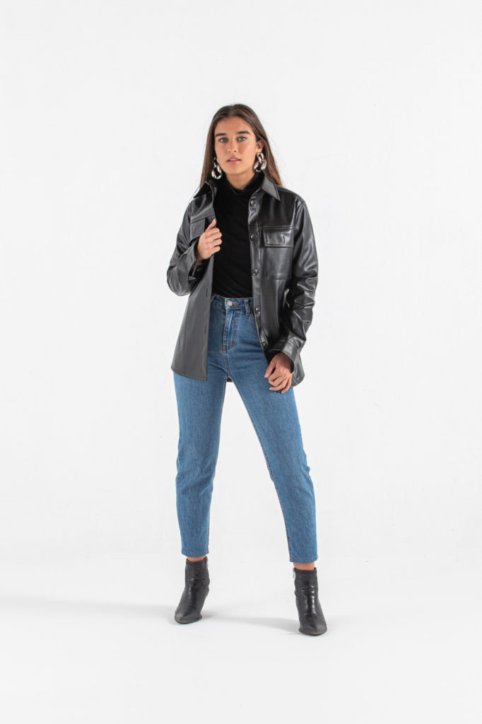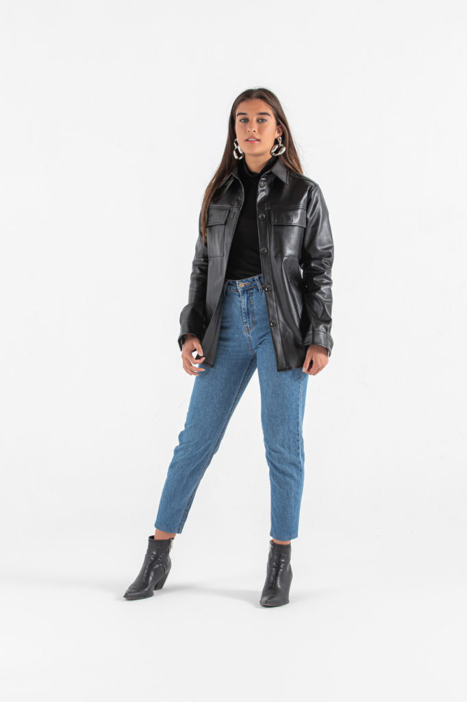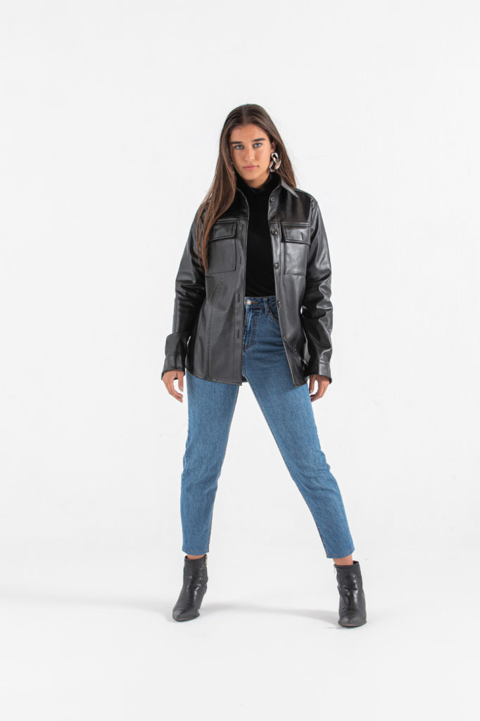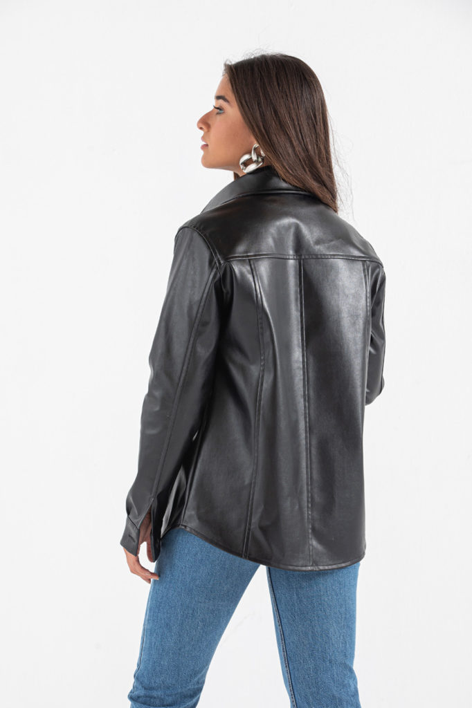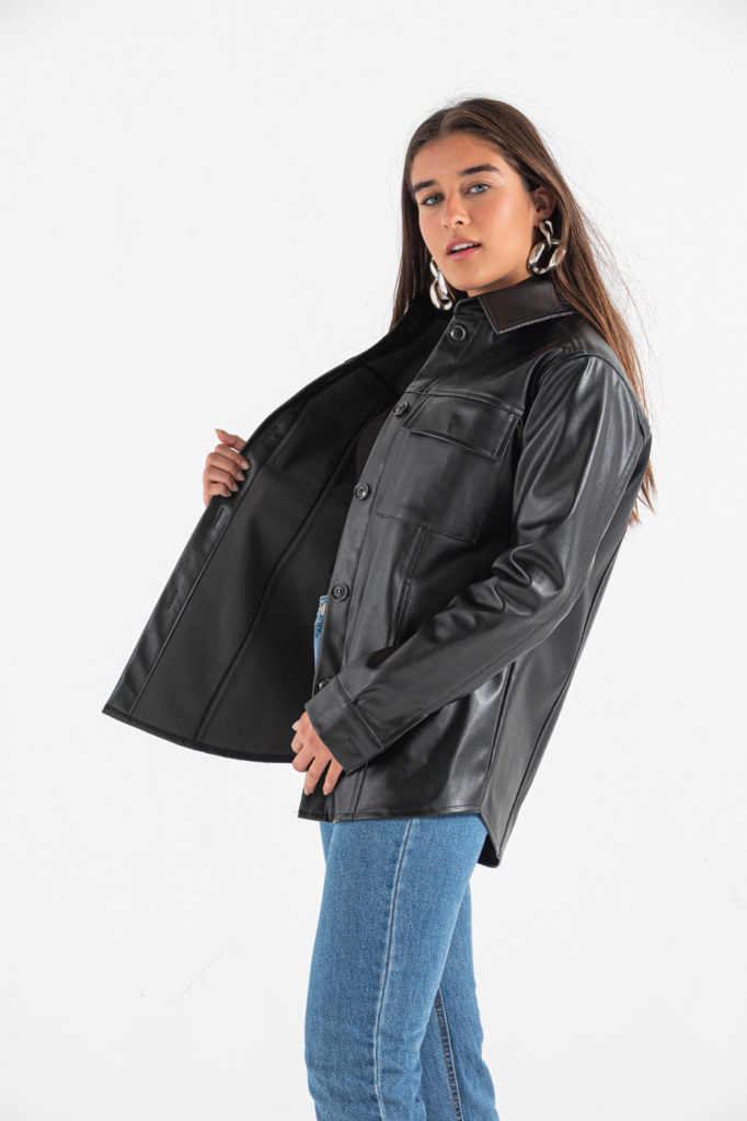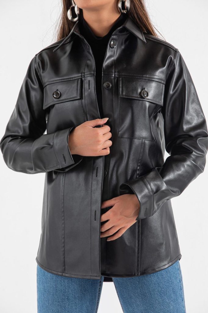 Level up your wardrobe with this faux leather jacket. This jacket features a point collar, front chest functional pockets and big front buttons. Throw it on your favorite outfit, put your boots on and you are ready to go!Size Details