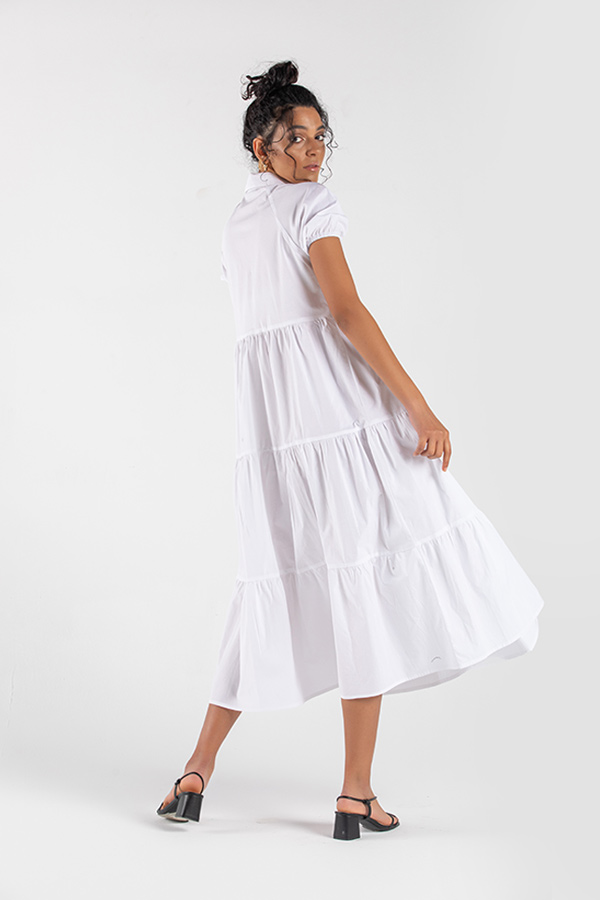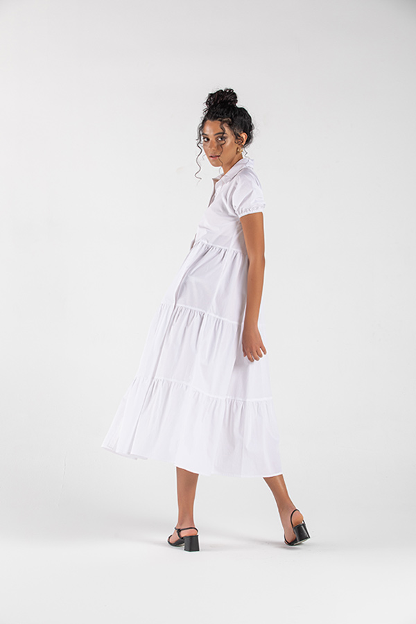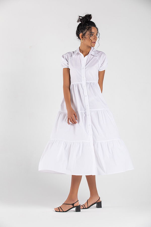 Here's our top pick dress this season! This white dress is fabricated from poplin and features an overall plain design, spread collar, cap sleeves with buttoned cuffs. Put your colored sandals on and spin around in style!Size Details
