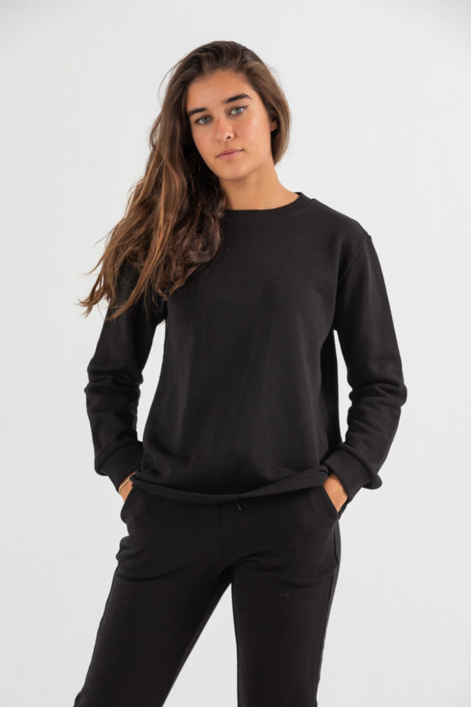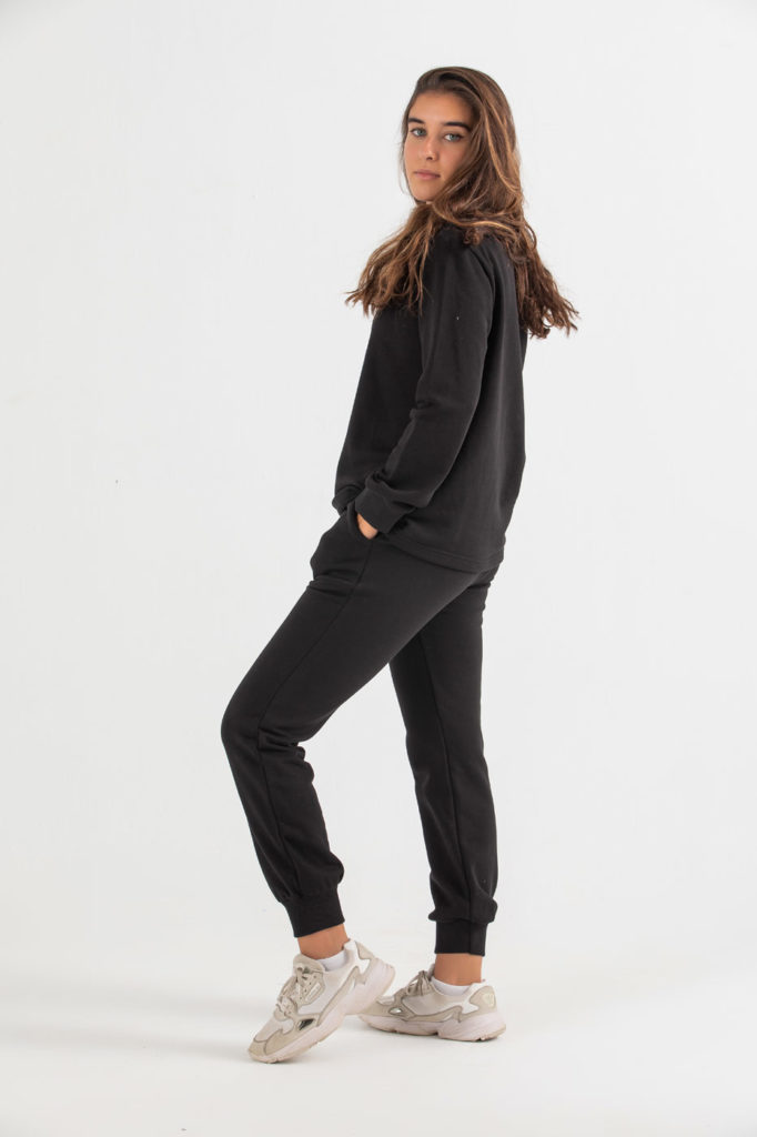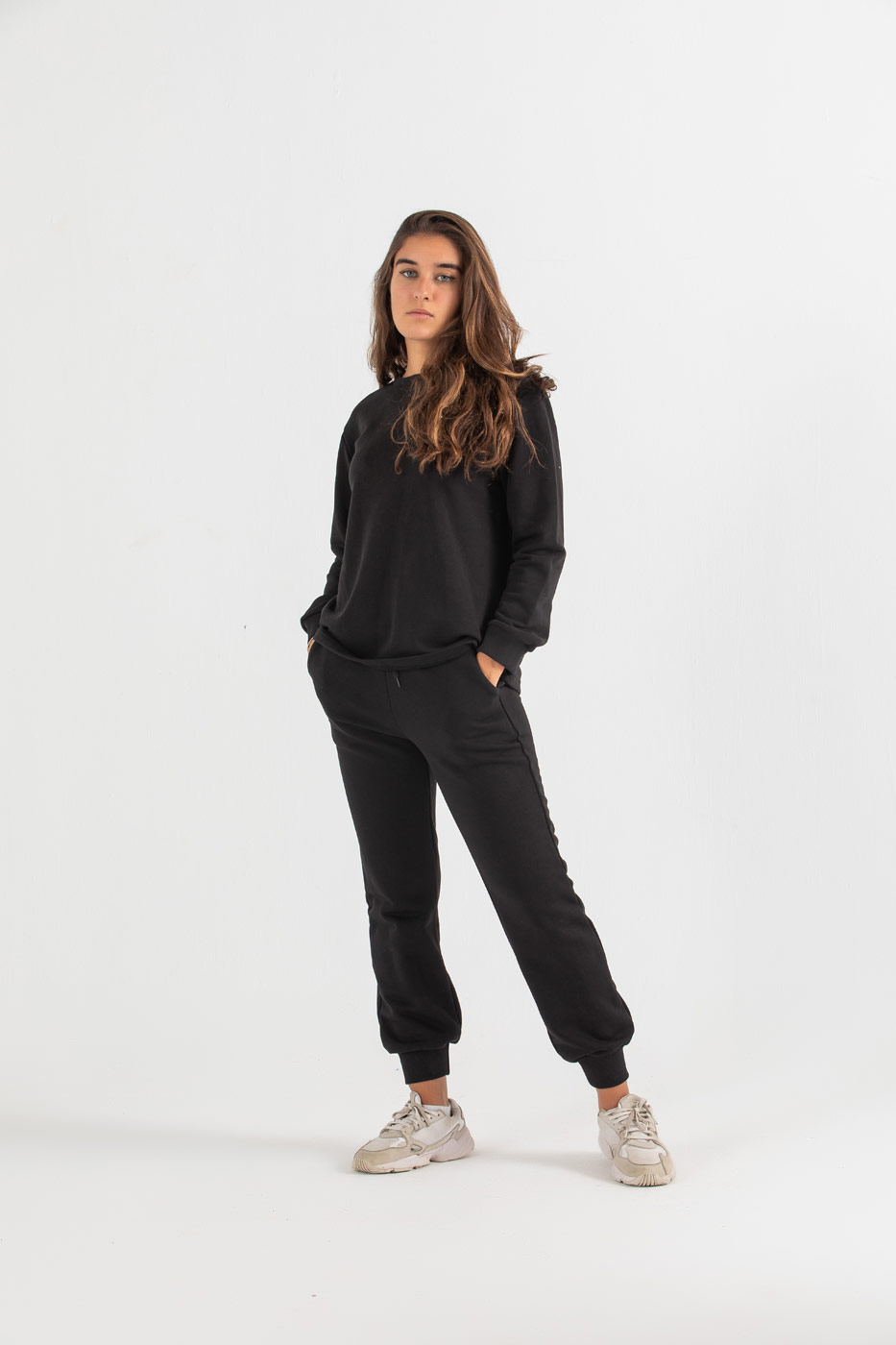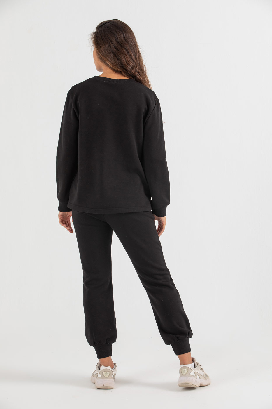 A monochromatic black outfit that doesn't need any effort in styling. This cotton set comes in two pieces: A sleeved sweat shirt with round neck and ribbed cuffs. A mid-rise joggers with elasticated waist, waist tie and cuffed hem. Put your sneakers on and you are ready to go!Size Details