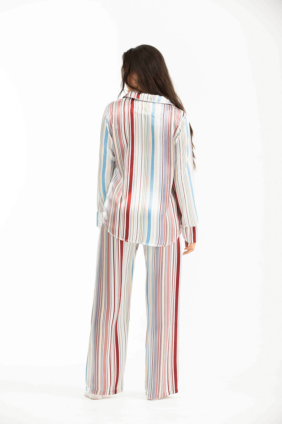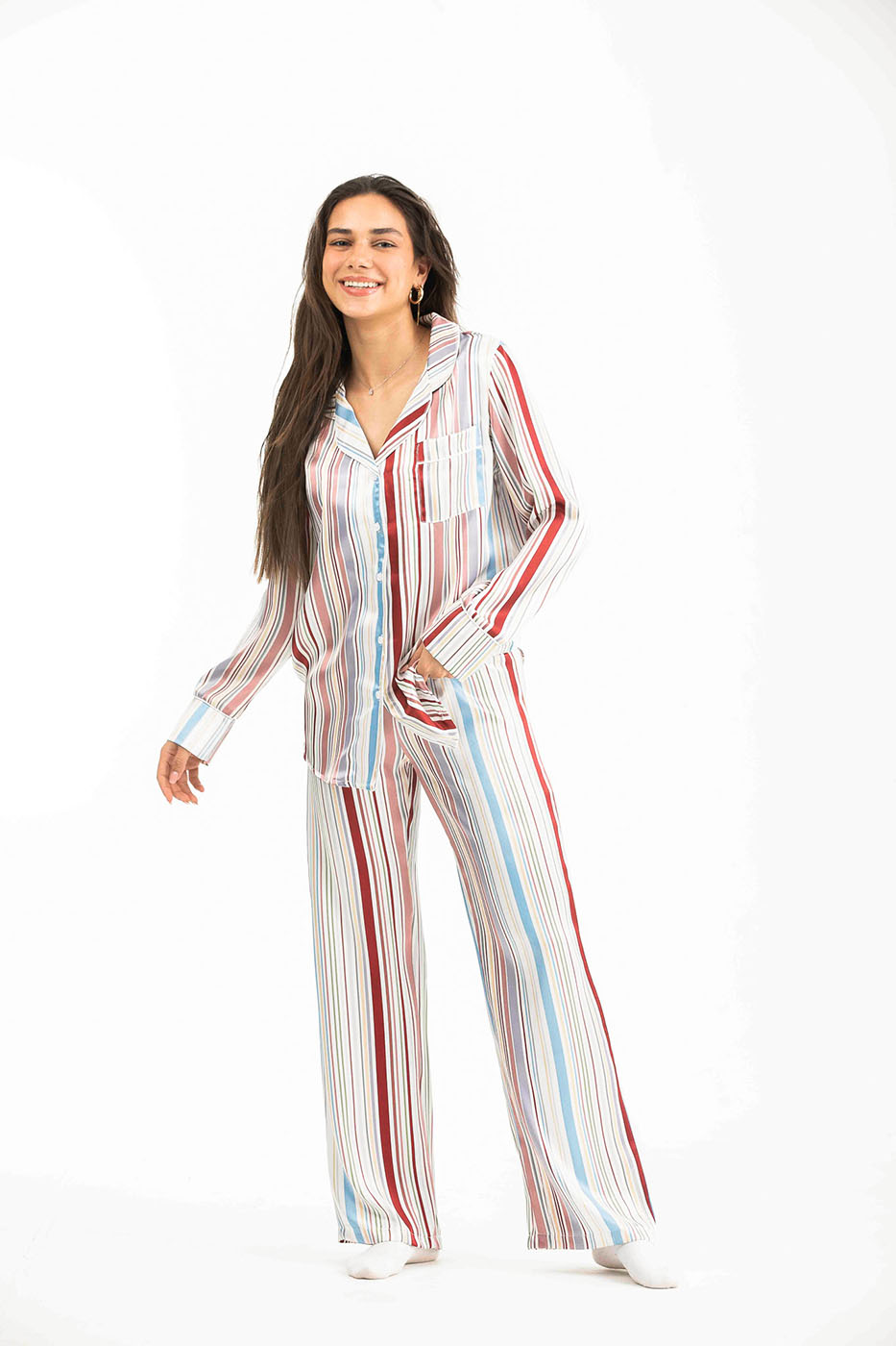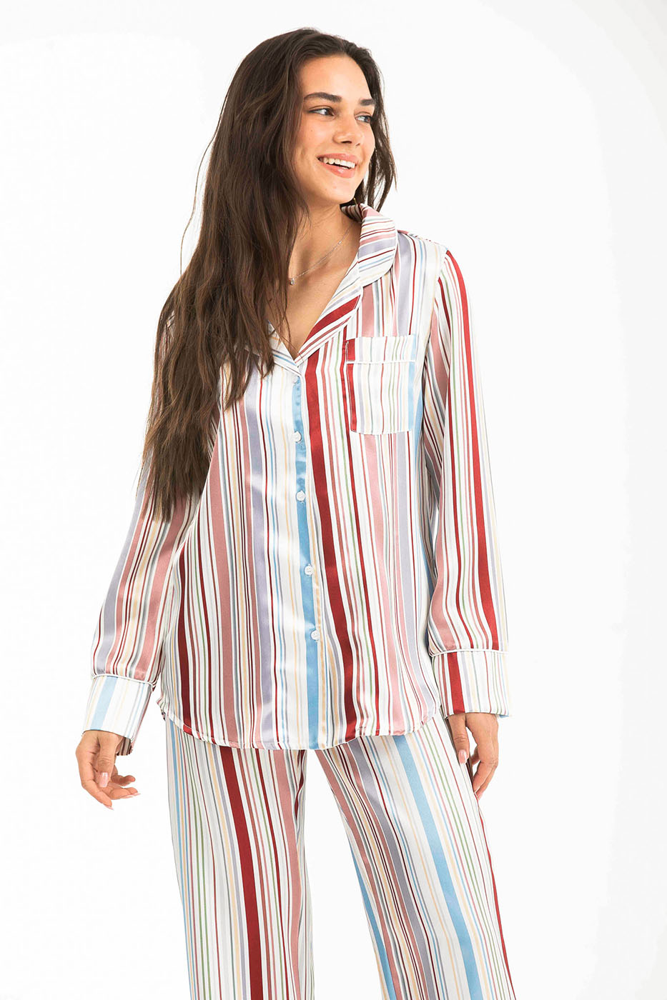 Colorful Buttoned Long Sleeved With Front Pocket Satin Pyjama Set