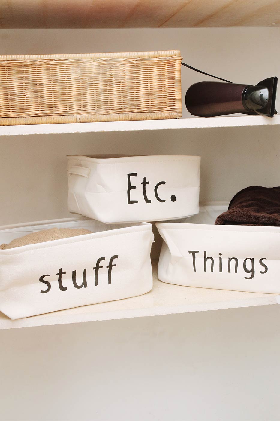 Your new favorite home organizer. Light heartedly labeled, but makes so much sense! Organize your clutter in a fun and classy way.