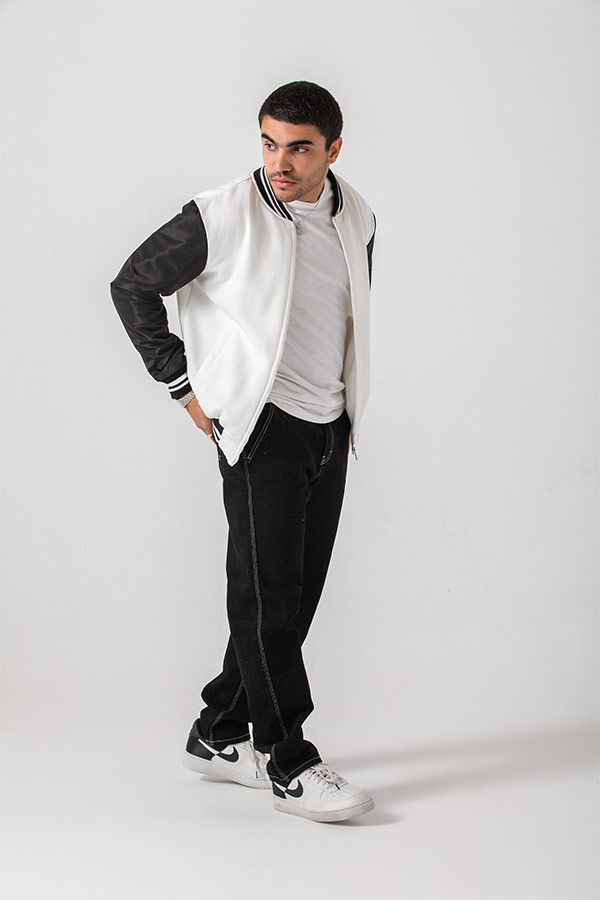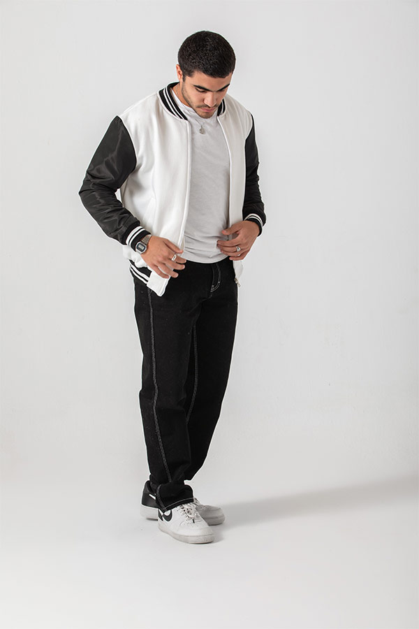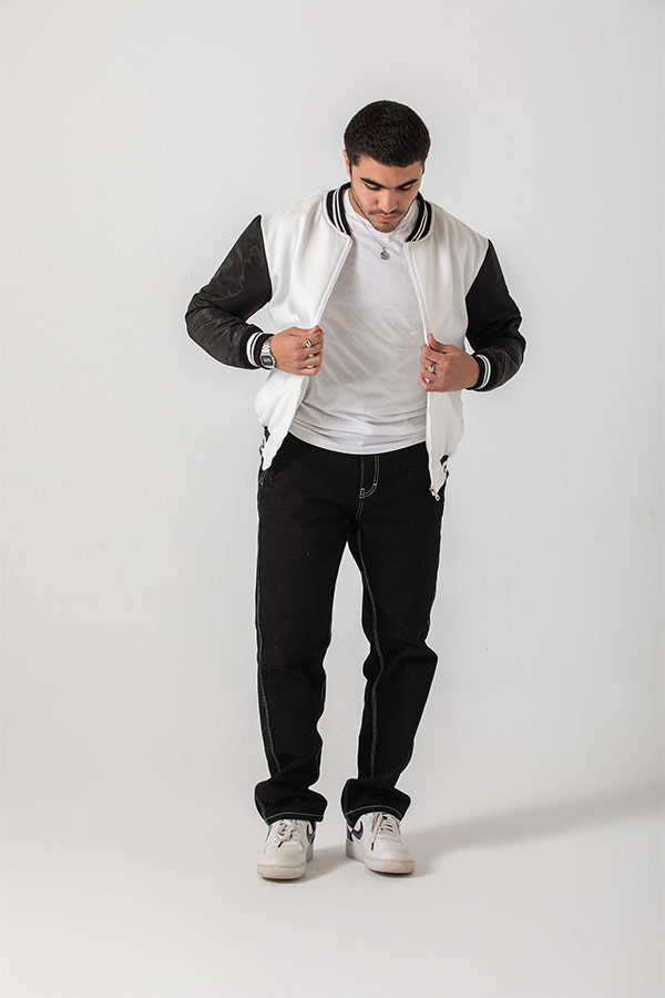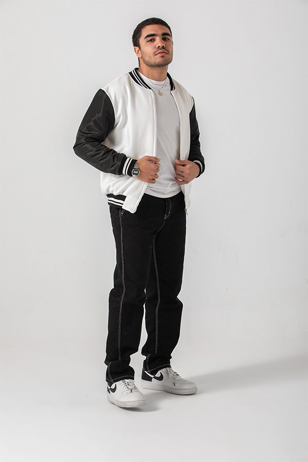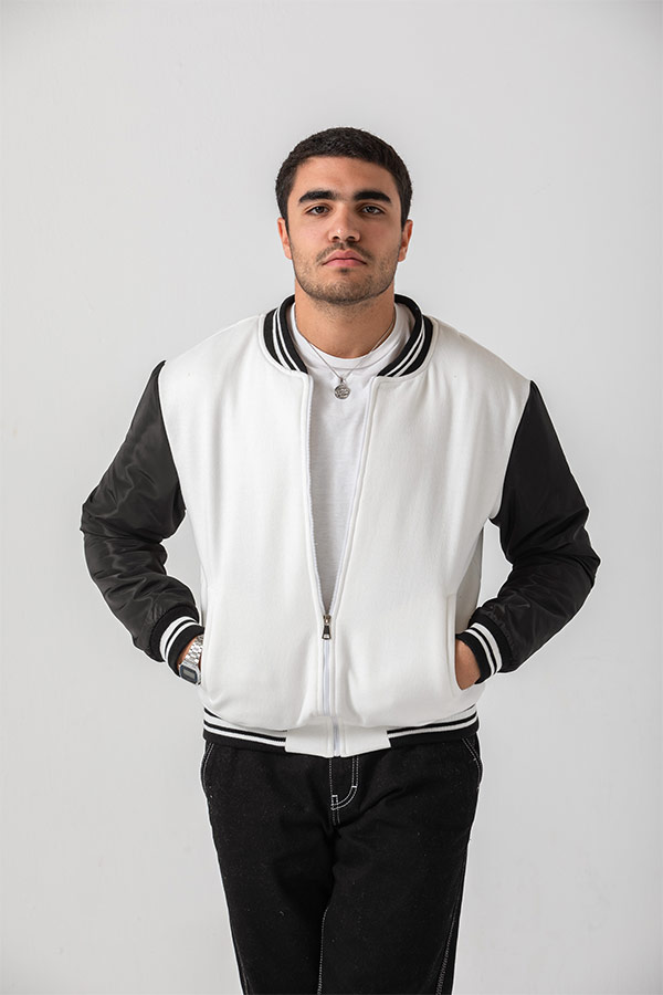 Mix and match fabrics with our Fitted B&W Varsity Jacket with soft Milton body and Waterproof sleeves perfect for rocking your street style, even on rainy days!Size Details
