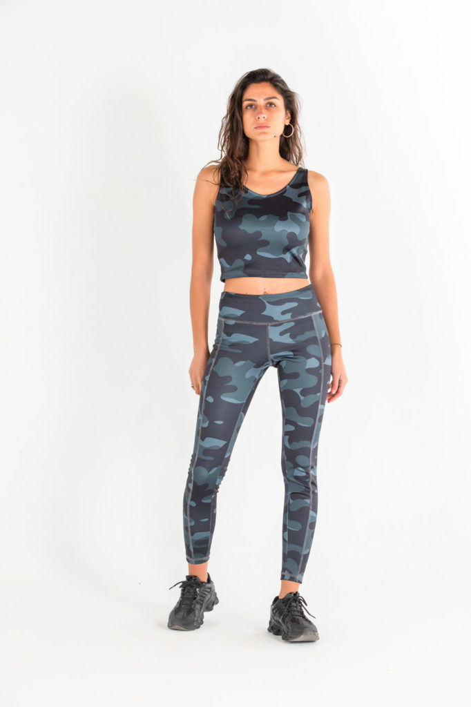 بلوزة رياضية مطبوعة من خامة مرنة مع تصميم عنق V.
