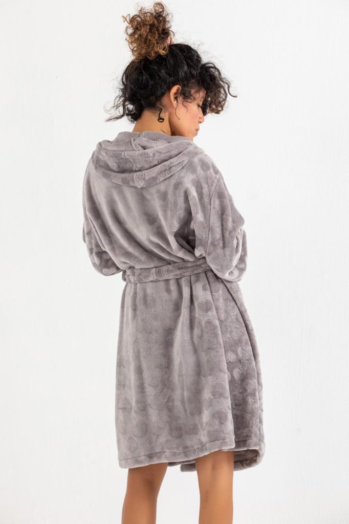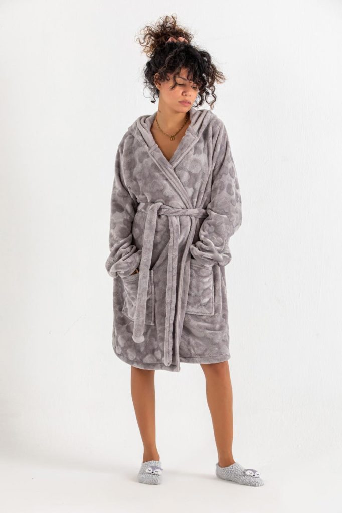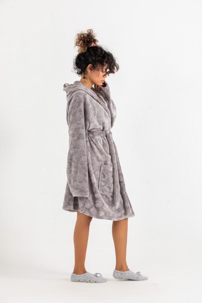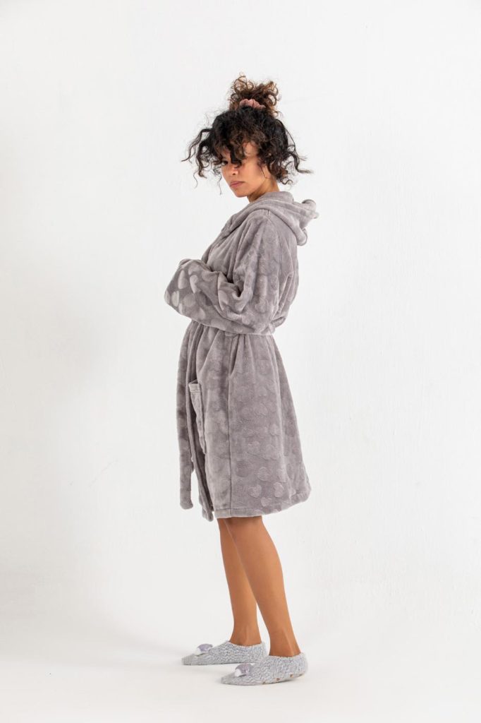 Lounging done right in our robe ! This robe is fabricated from wool and features all over engraved hearts, fixed hood, side pockets to stash your winter neccessities and a waist tie. Put your mules on and roam around in comfy style!Size Details
