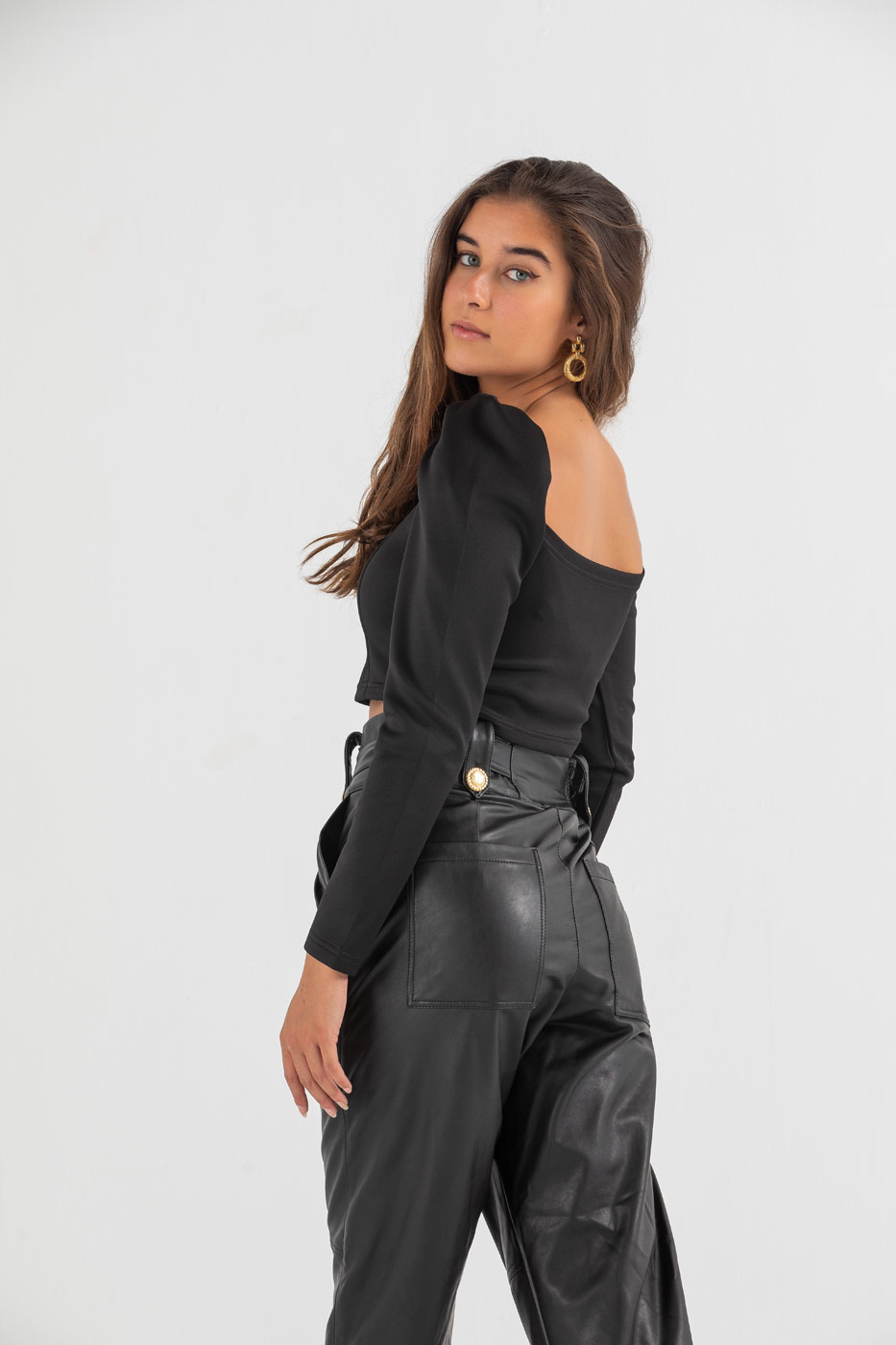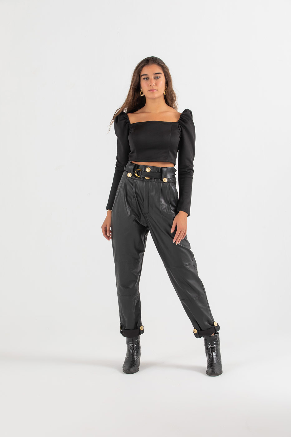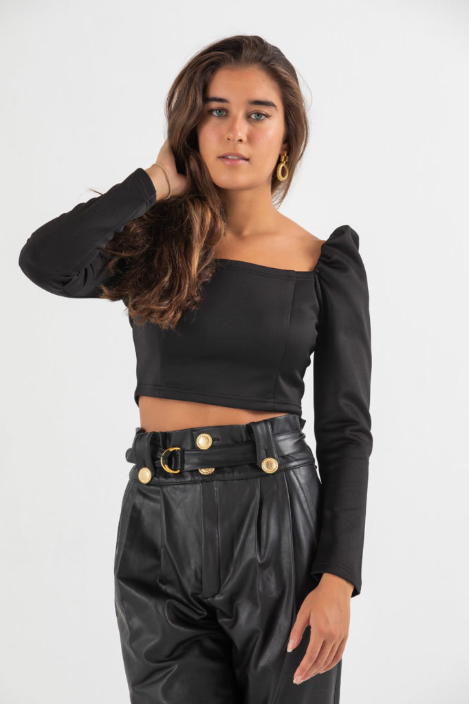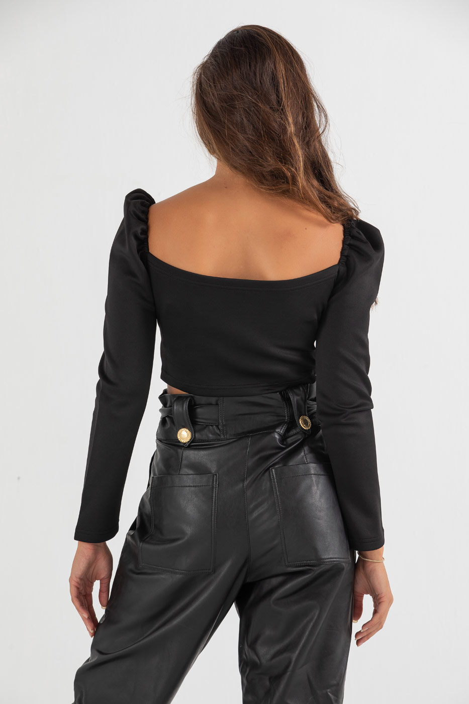Style your cropped black top with your black high-waisted pants and boots to be just on point! The black top is fabricated from stretchy fabric and features a square neck, puffy long sleeves and square back.Size Details