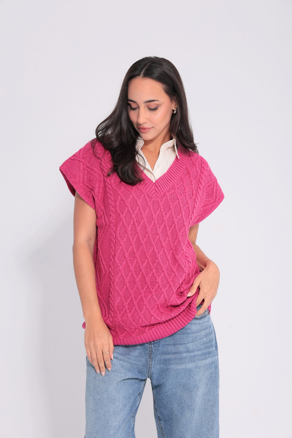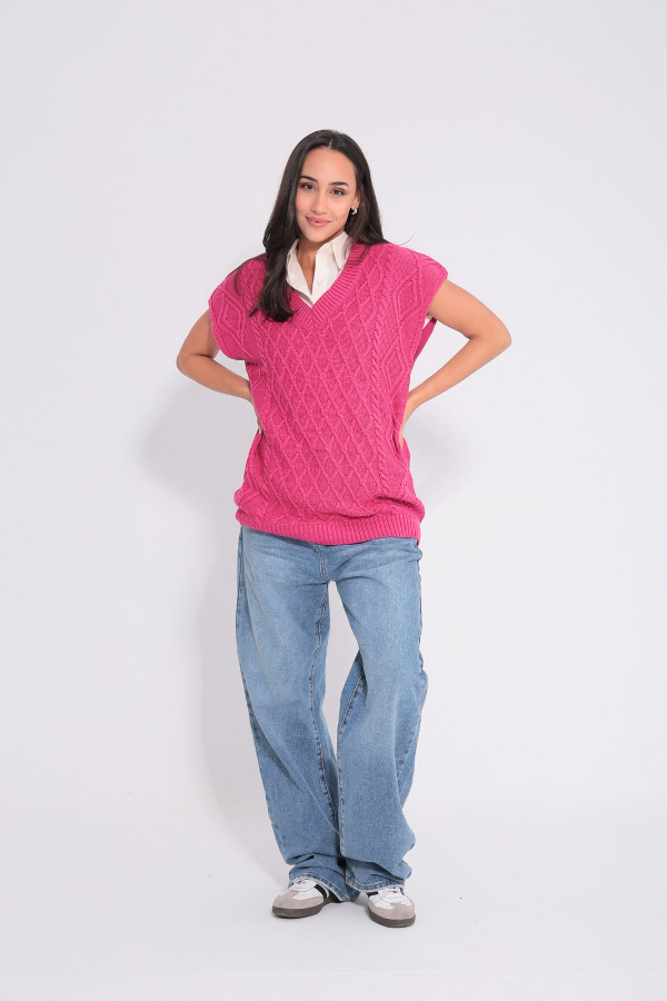 بلوزة محاكة بدون أكمام بقصة مستقيمة مع تصميم عنق v .