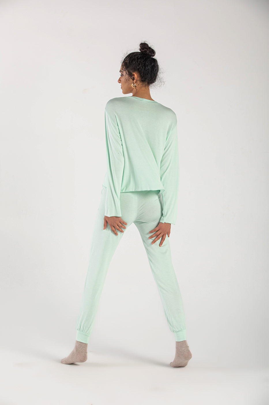 Stay in bed in our relaxed ' Lazy In Bed ' set. This set comes in two pieces: A cotton lycra sleeved top with a crew neck and A straight cut bottoms with an elasticated waist, functional pockets and fitted cuffs. Put on your favorite pair of socks and roam around in style.Size Details