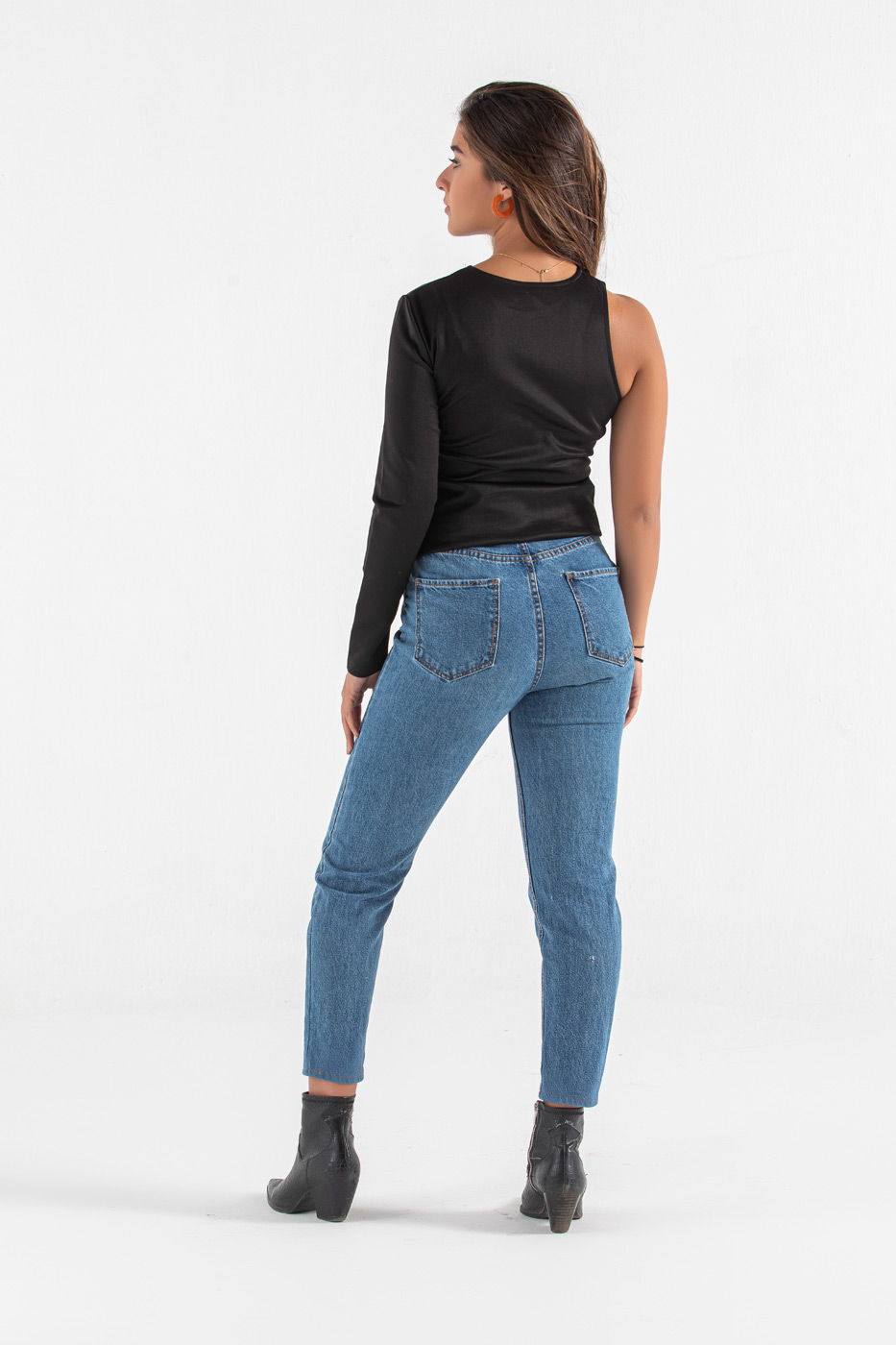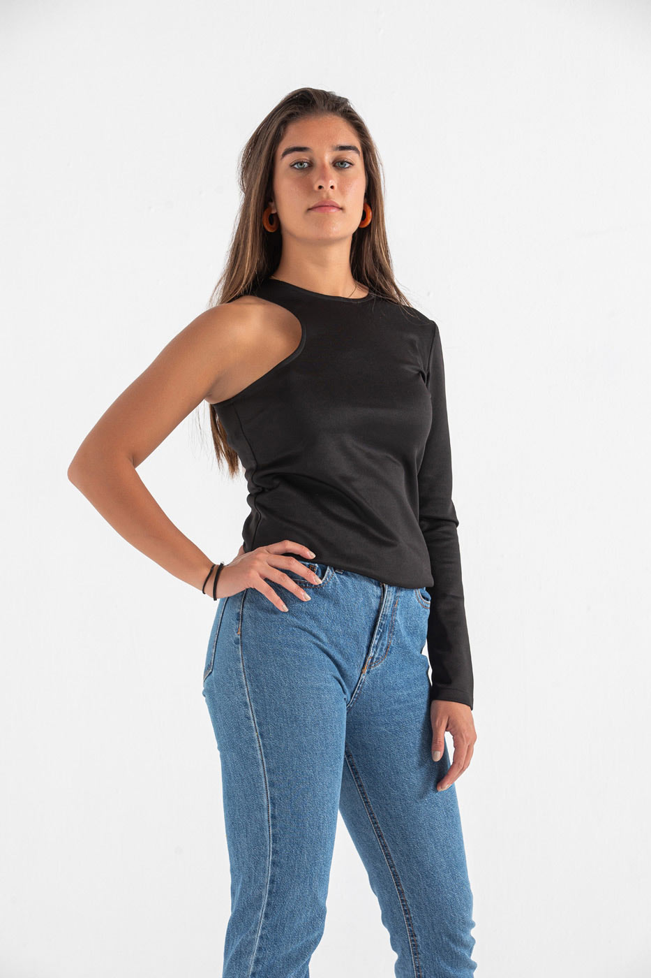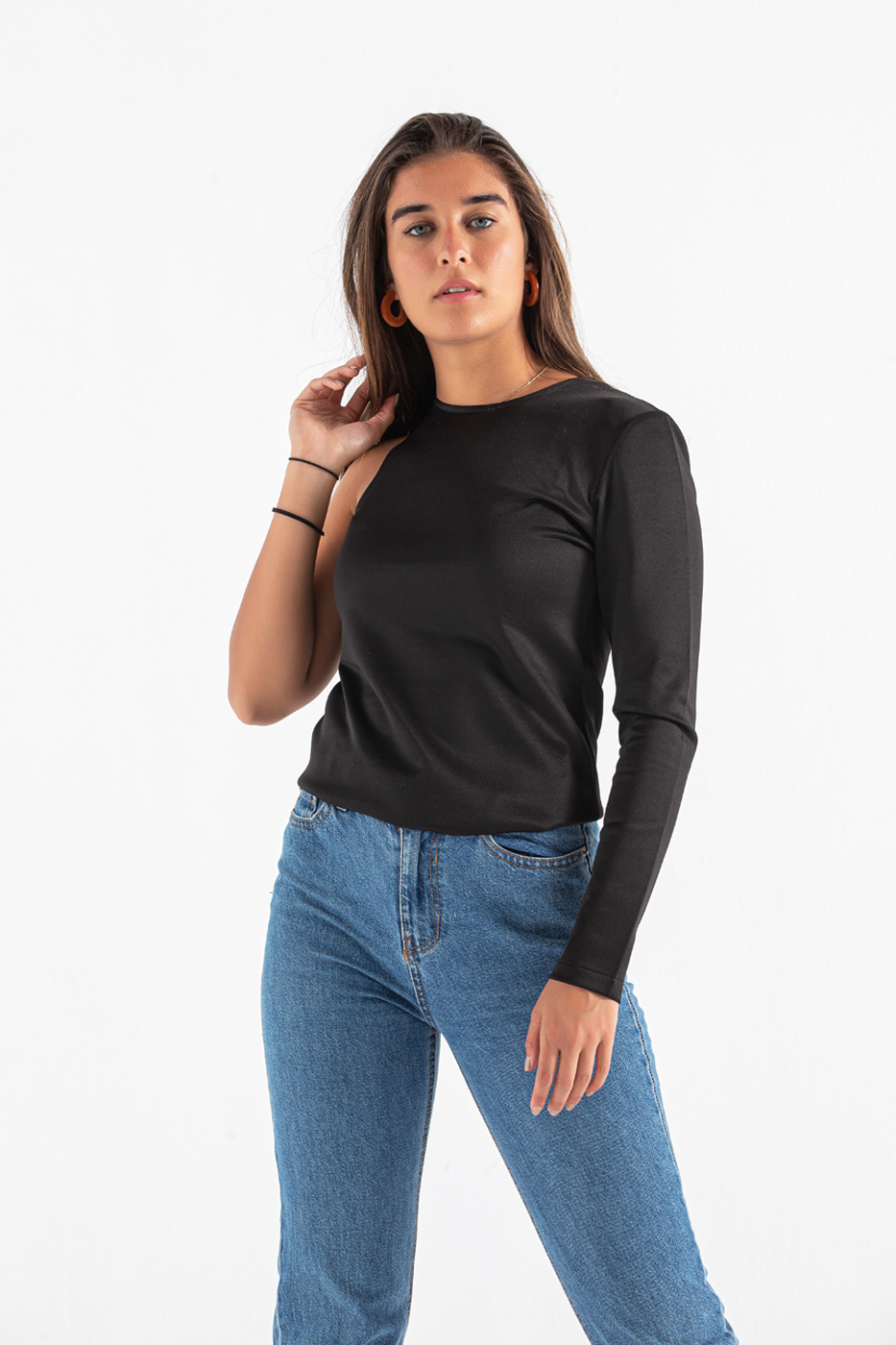 Head to the party in this black top. This top features an overall plain design, round neck and one sleeve design. Style it with your denim and ankle boots to hit the party in style.Size Details