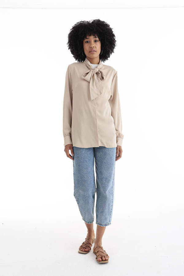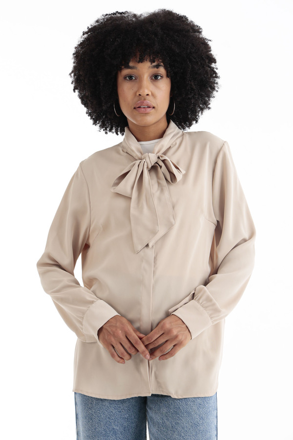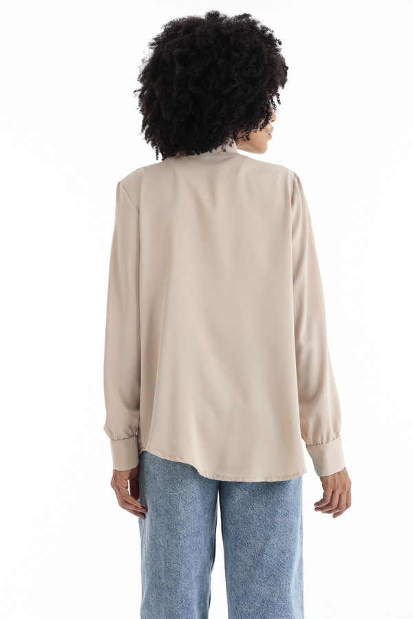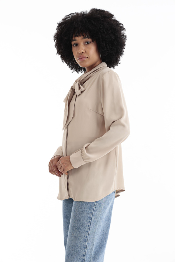 Long Sleeve Tie Front Shirt In BeigeSize Details