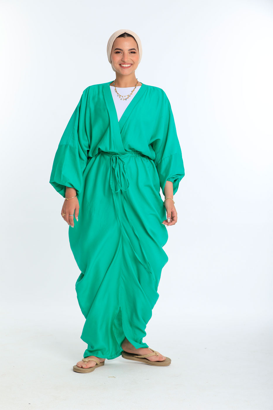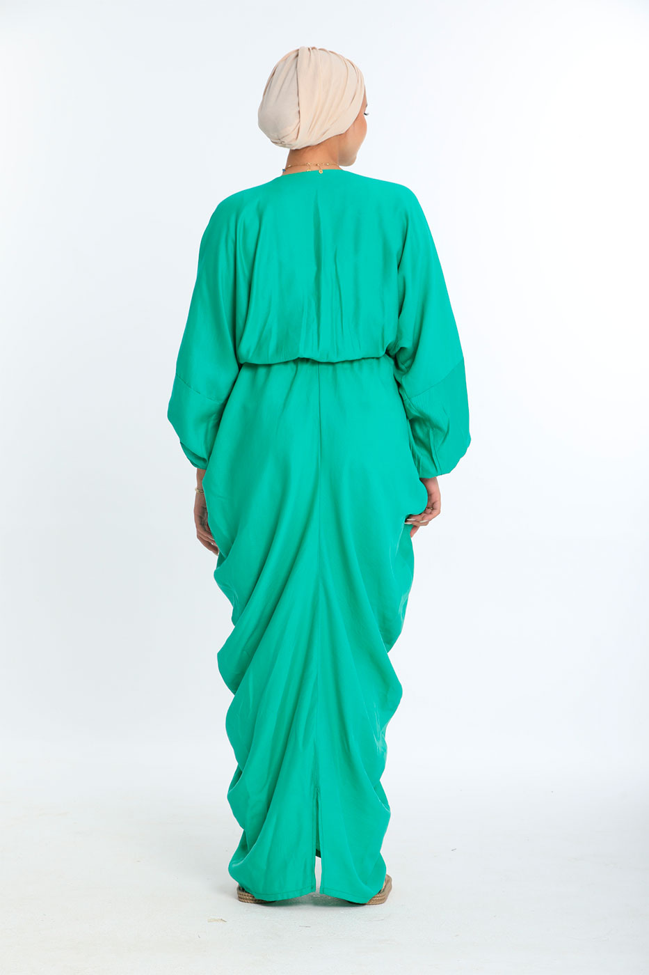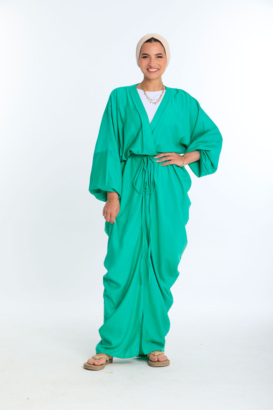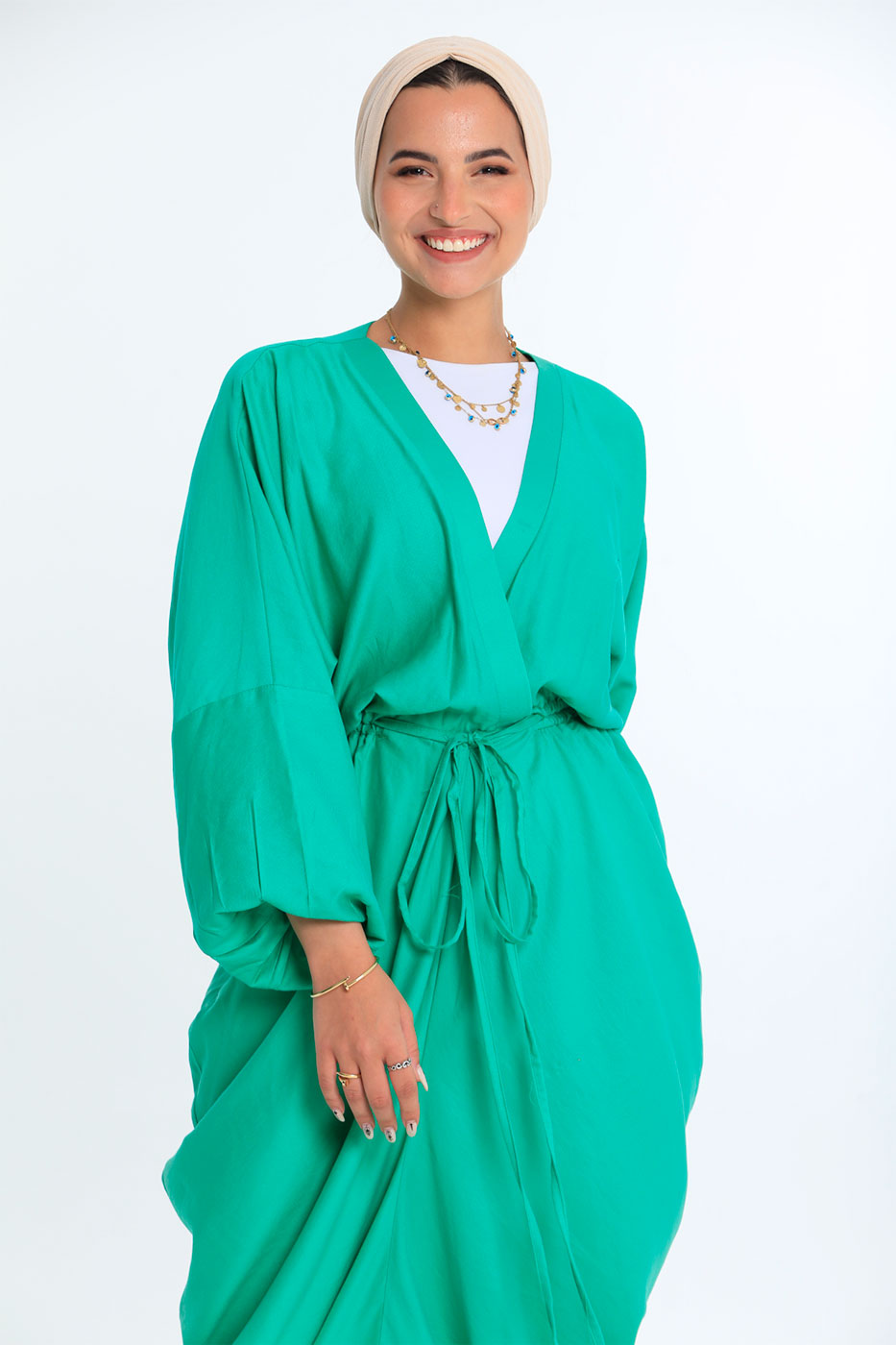 فستان بقصة متبايتة و خصر مرن مع أكمام طويلة و تصميم عنق V .