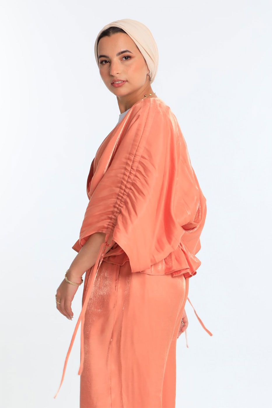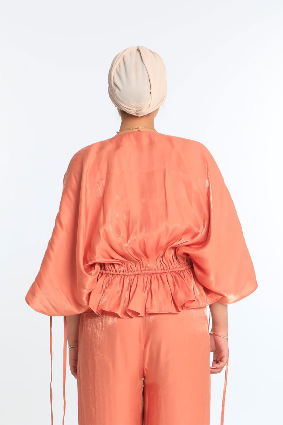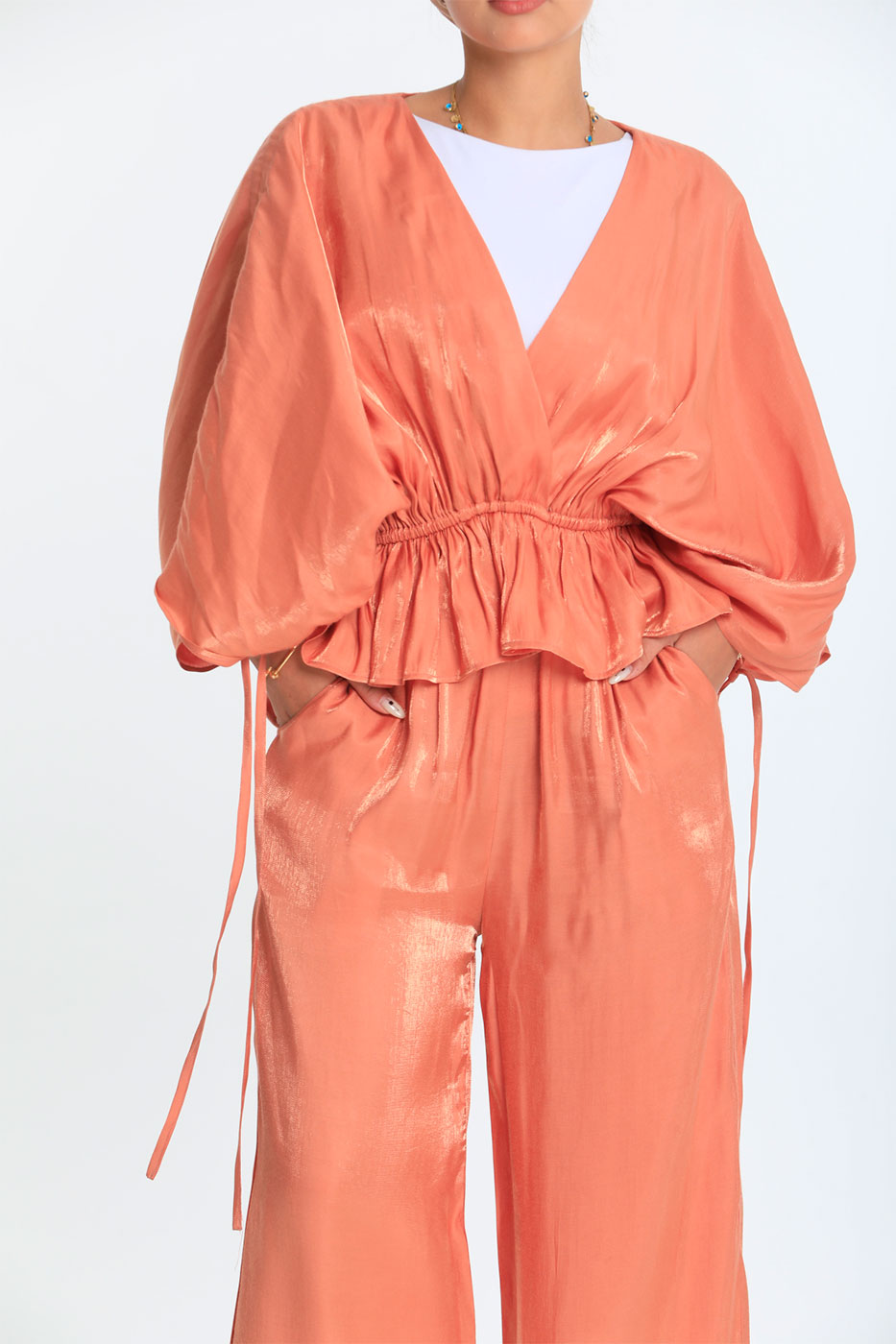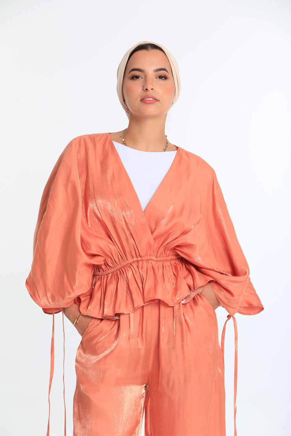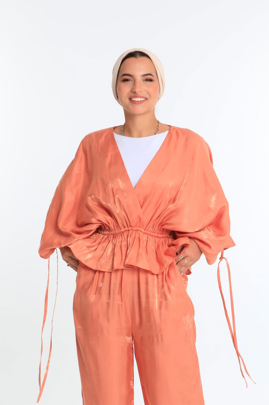 بلوزة مزينة بأربطة مع أكمام قصيرة و تصميم عنق V.