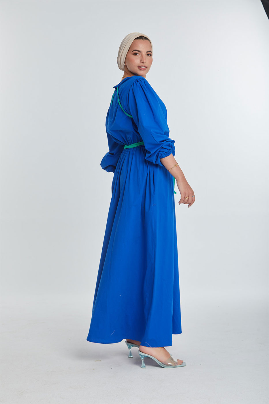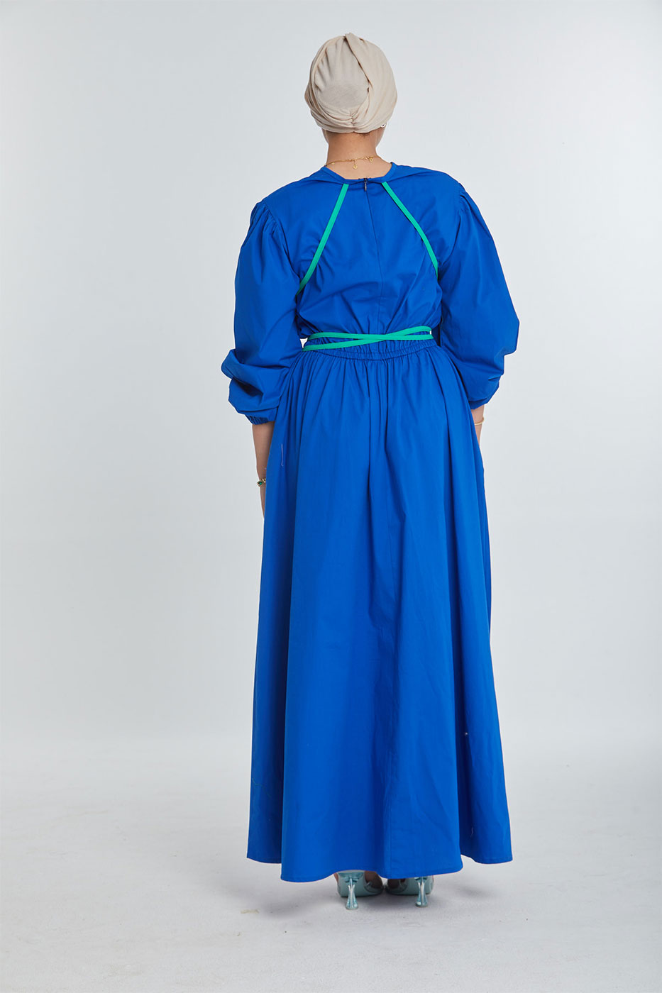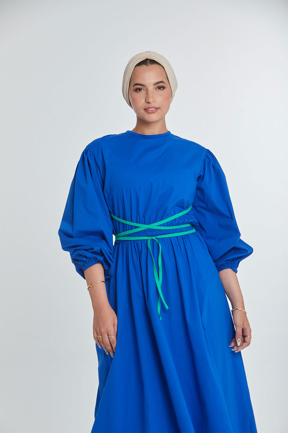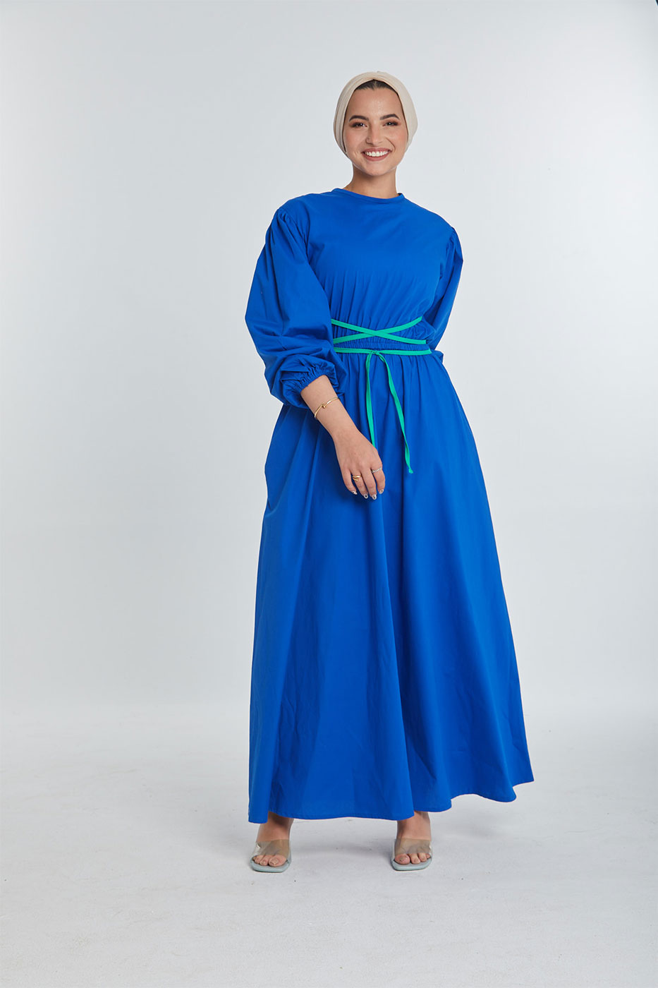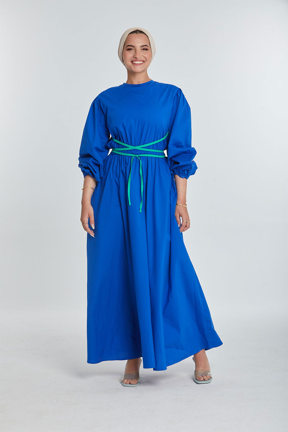 فستان بأكمام بالون مزين بأربطة مع تصميم عنق دائرى.