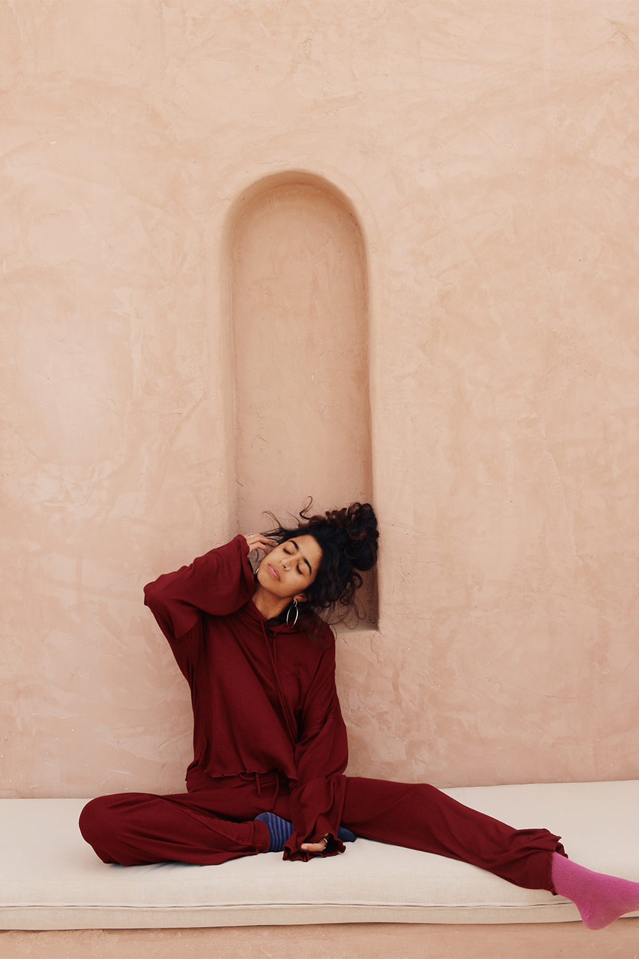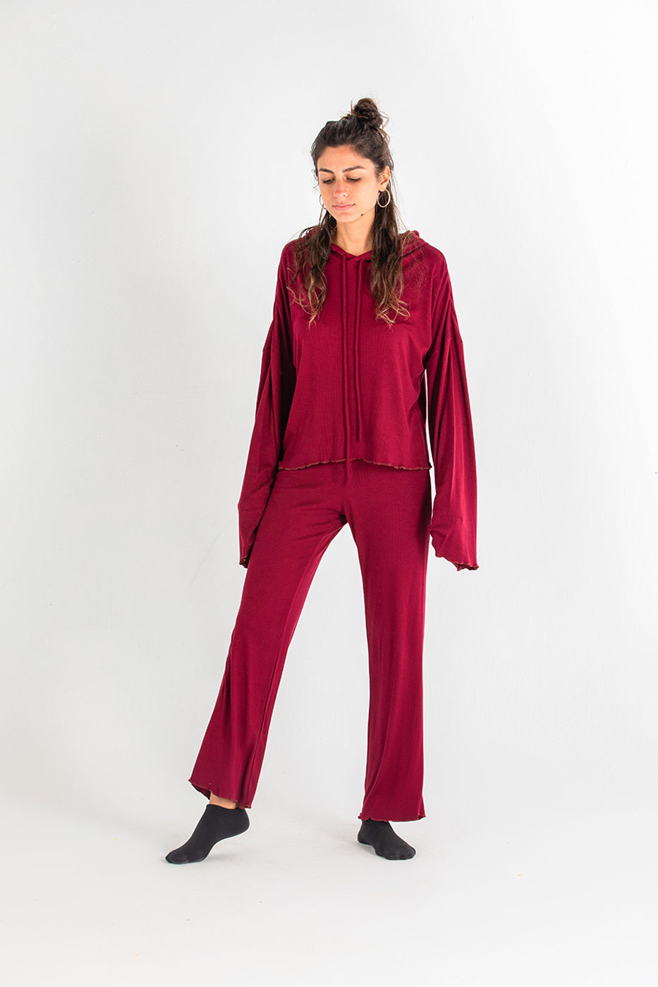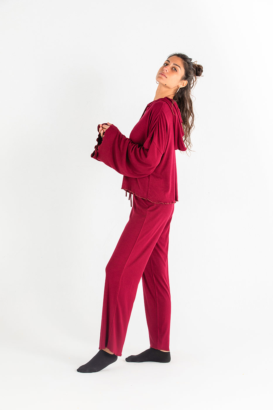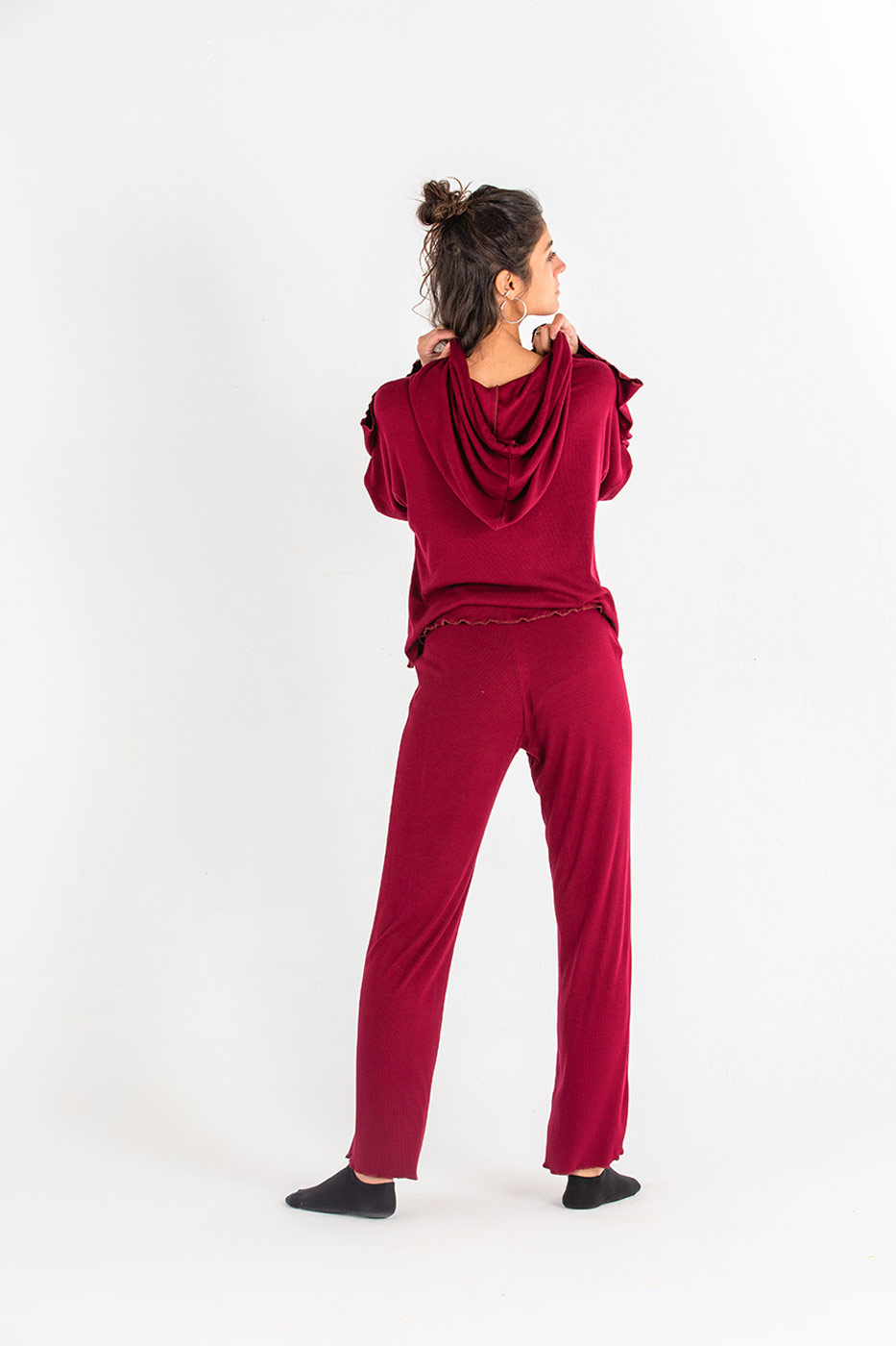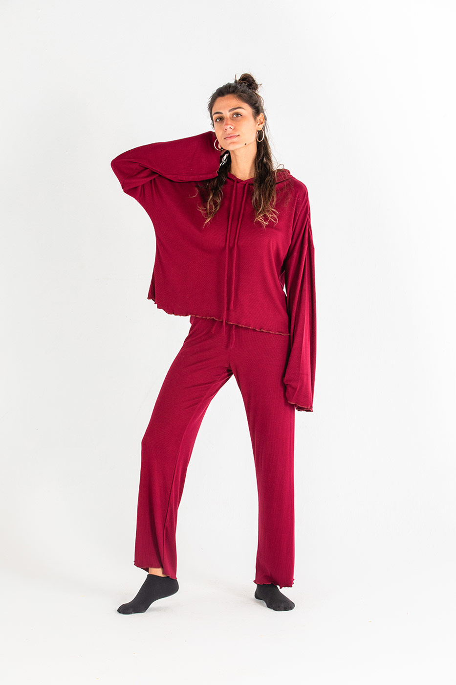 Lounge in style in our ribbed ' Loose And Comfy ' set. The relaxed set comes in two pieces: A sleeved top with a round neck, hood, and lettuce-trim hem. A mid-rise relaxed pants with elasticated waist and lettuce-trim hem. Put your colorful socks on and roam around in style!Size Details