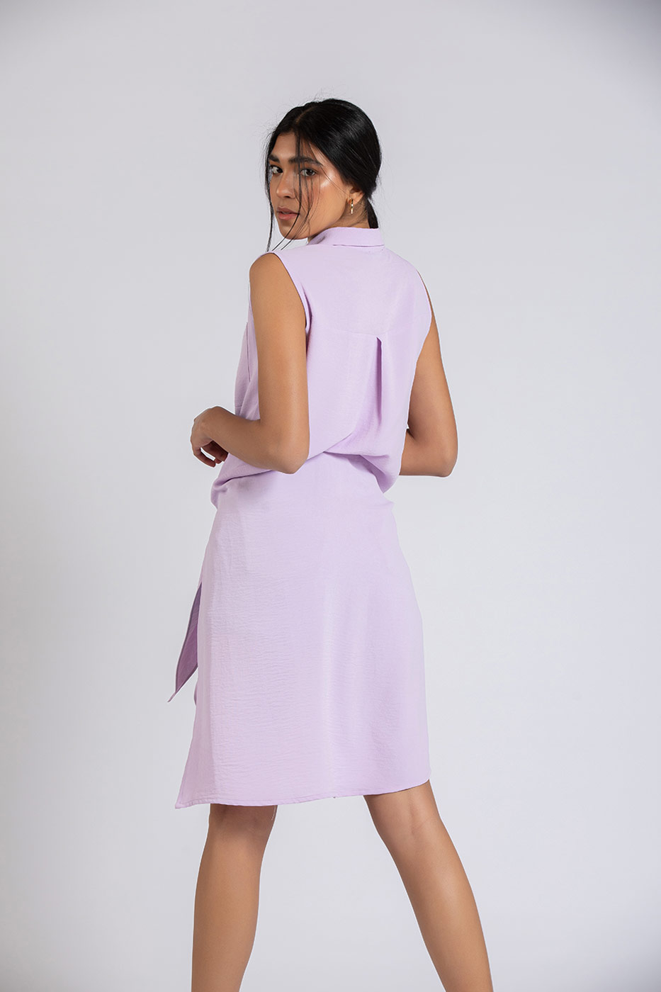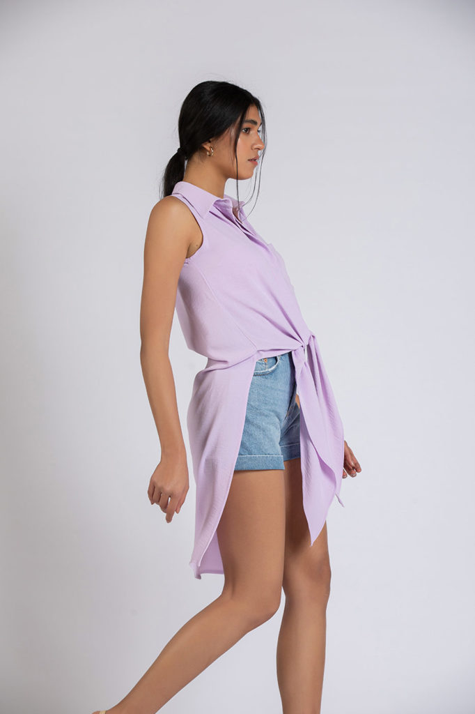 Can a top be more stylish? This sleeveless top features a spread collar, button-down detail with a tie-up front hem, and a long hem at the back. Style it with your denim shorts and you are ready to go!Size Details