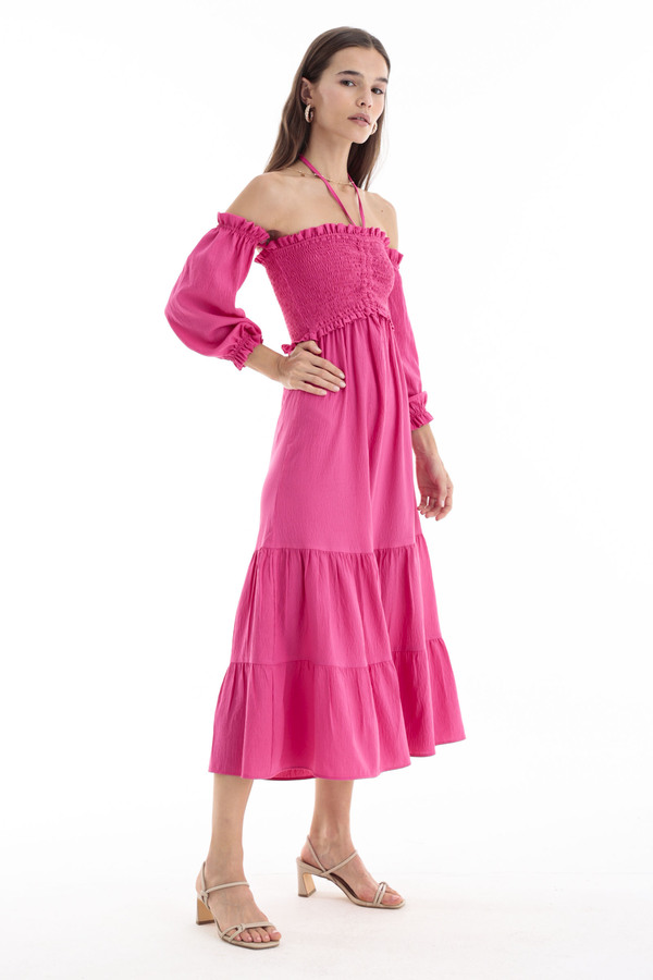 Off Shoulder Ruffle Dress In FuchsiaSize Details
