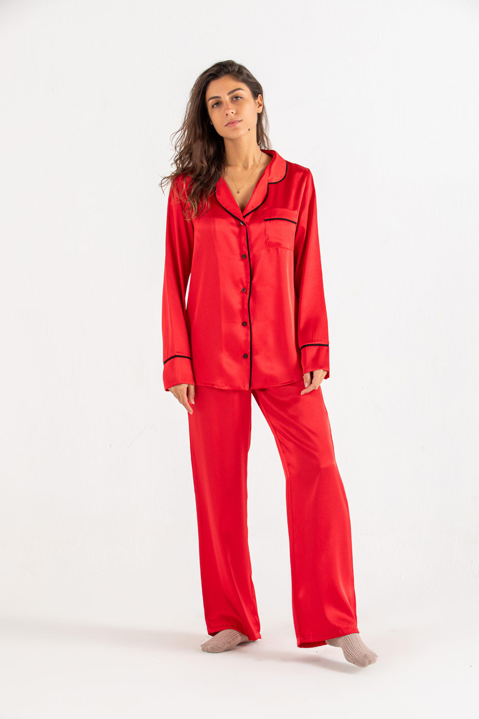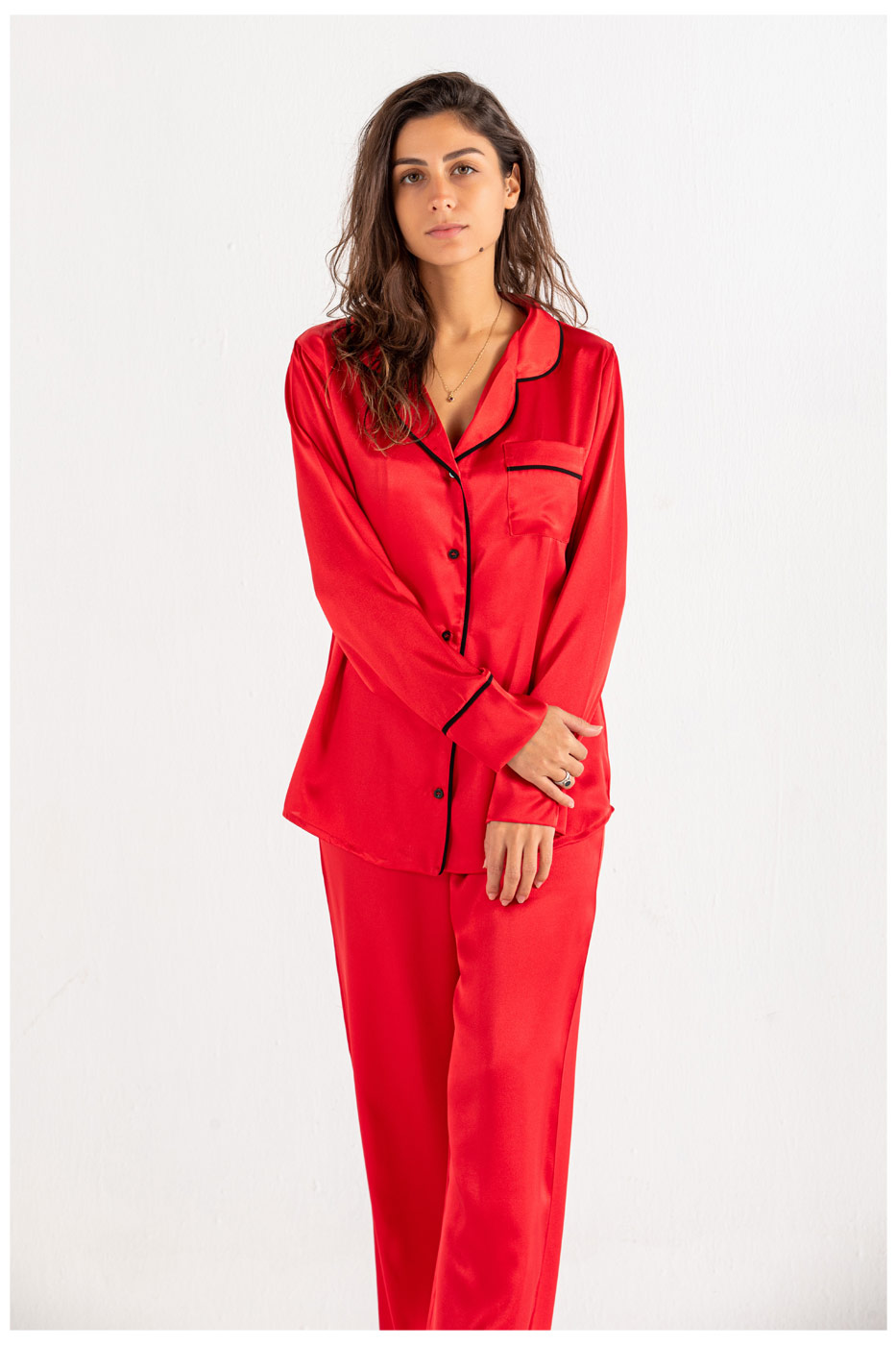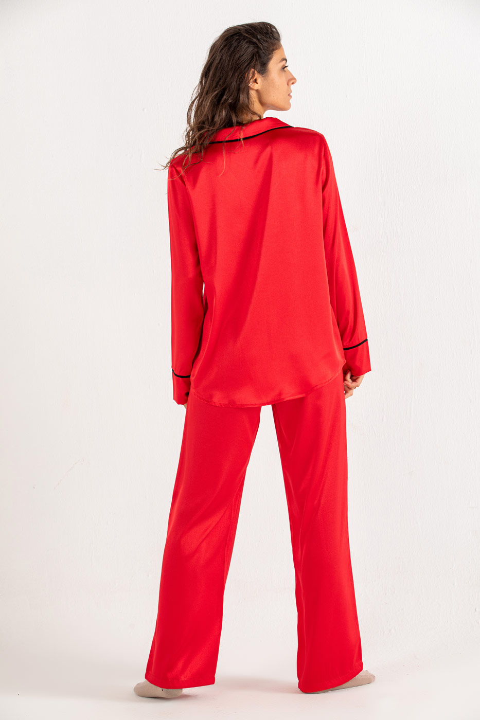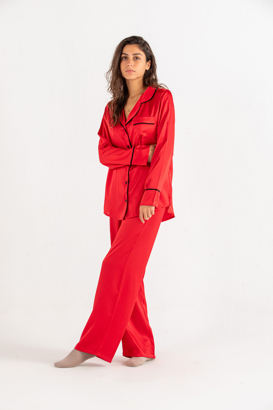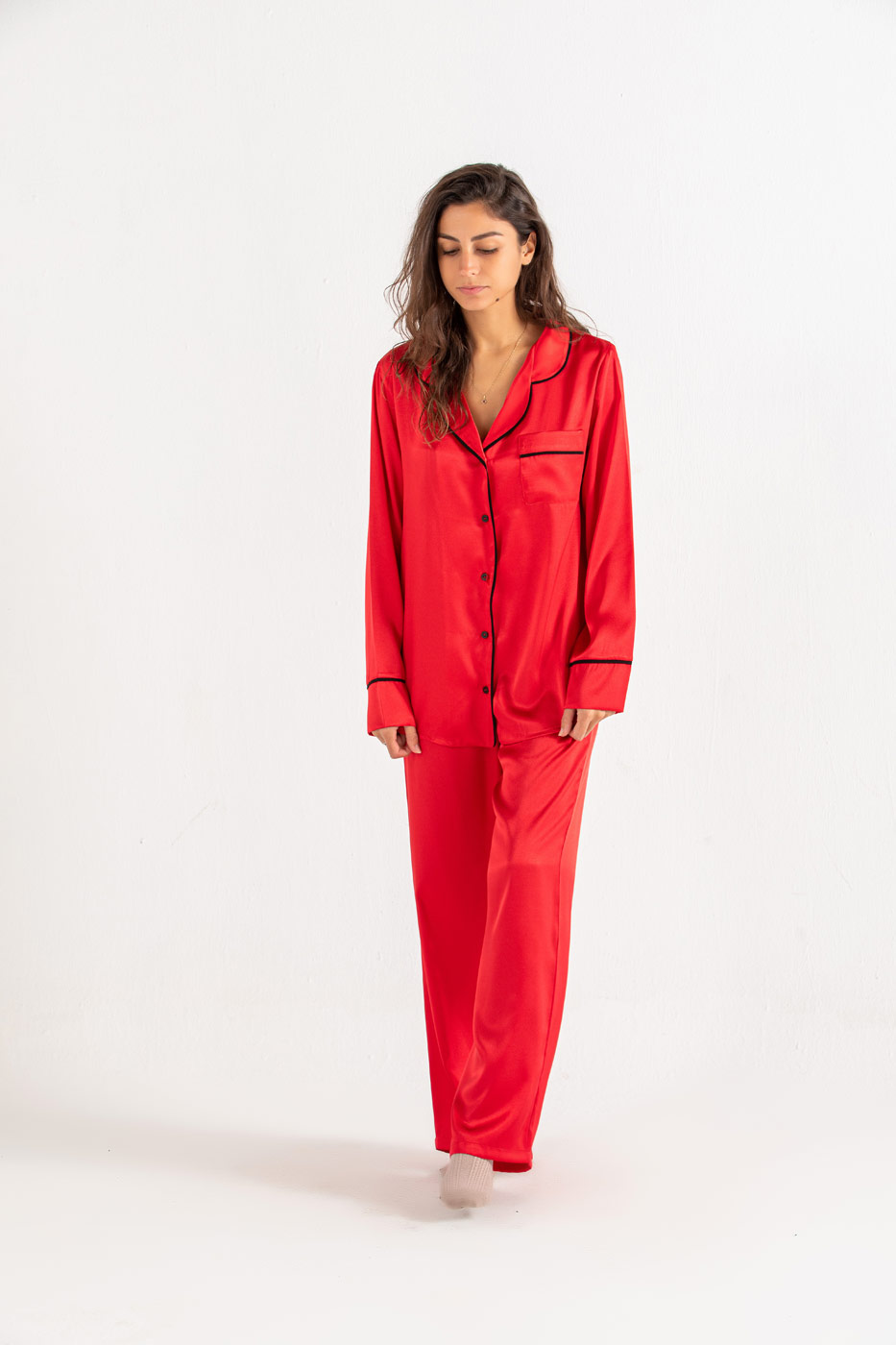 Off to a nap in this satan pyjama set. The relaxed set comes in two pieces a satan button through shirt with a collar, chest pocket and curved hem. A straight cut bottoms with an elasticated waist. Put on your favorite pair of socks and roam around in style.Size Details