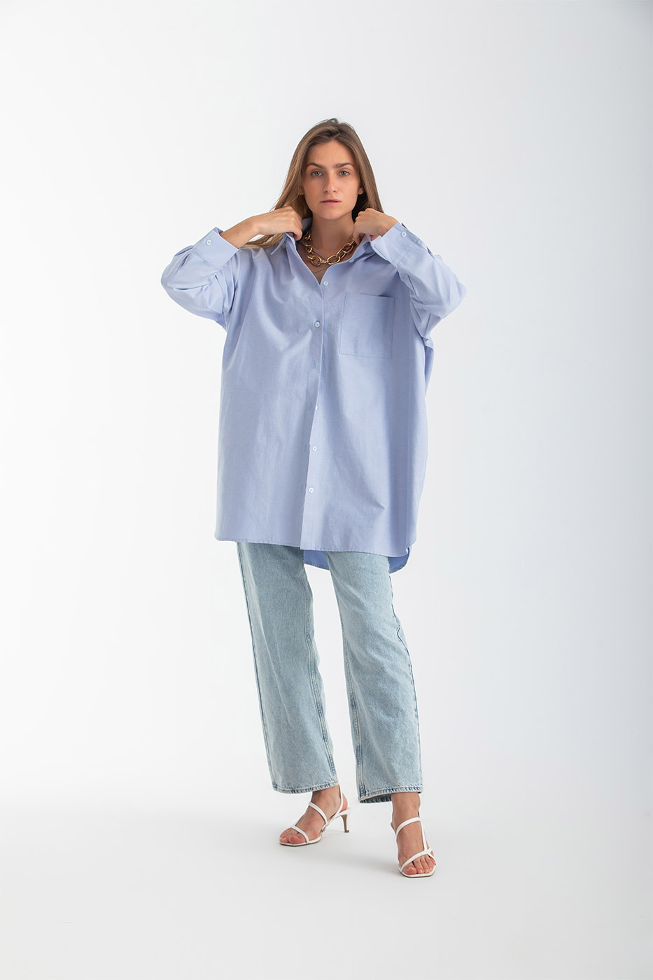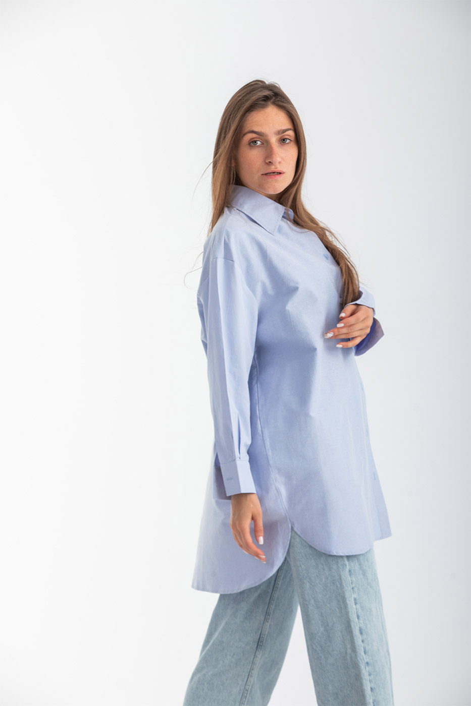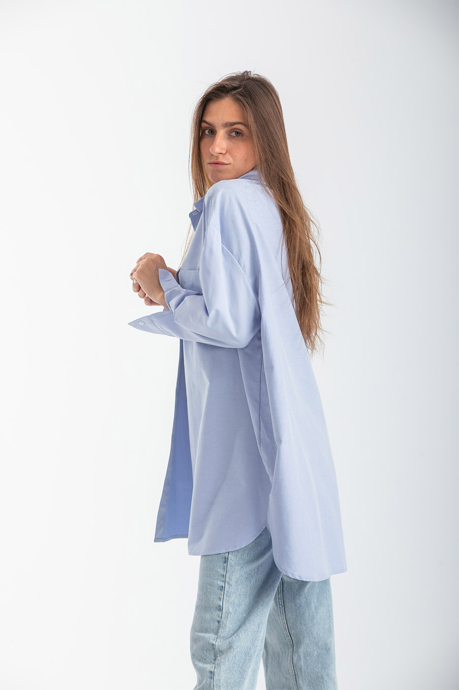 قميص بقصة فضفاضة مع اكمام طويلة و أزرار أمامية.