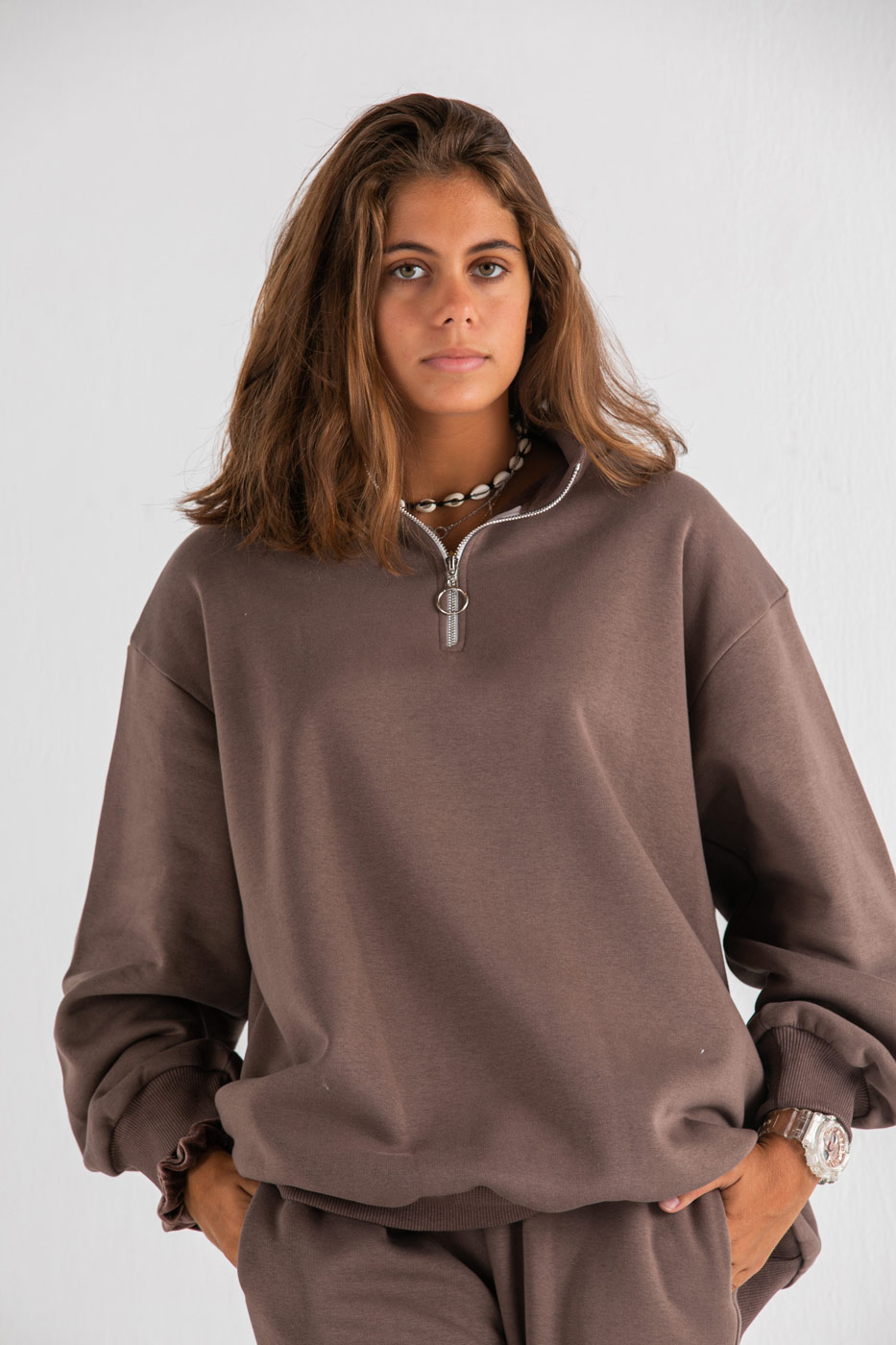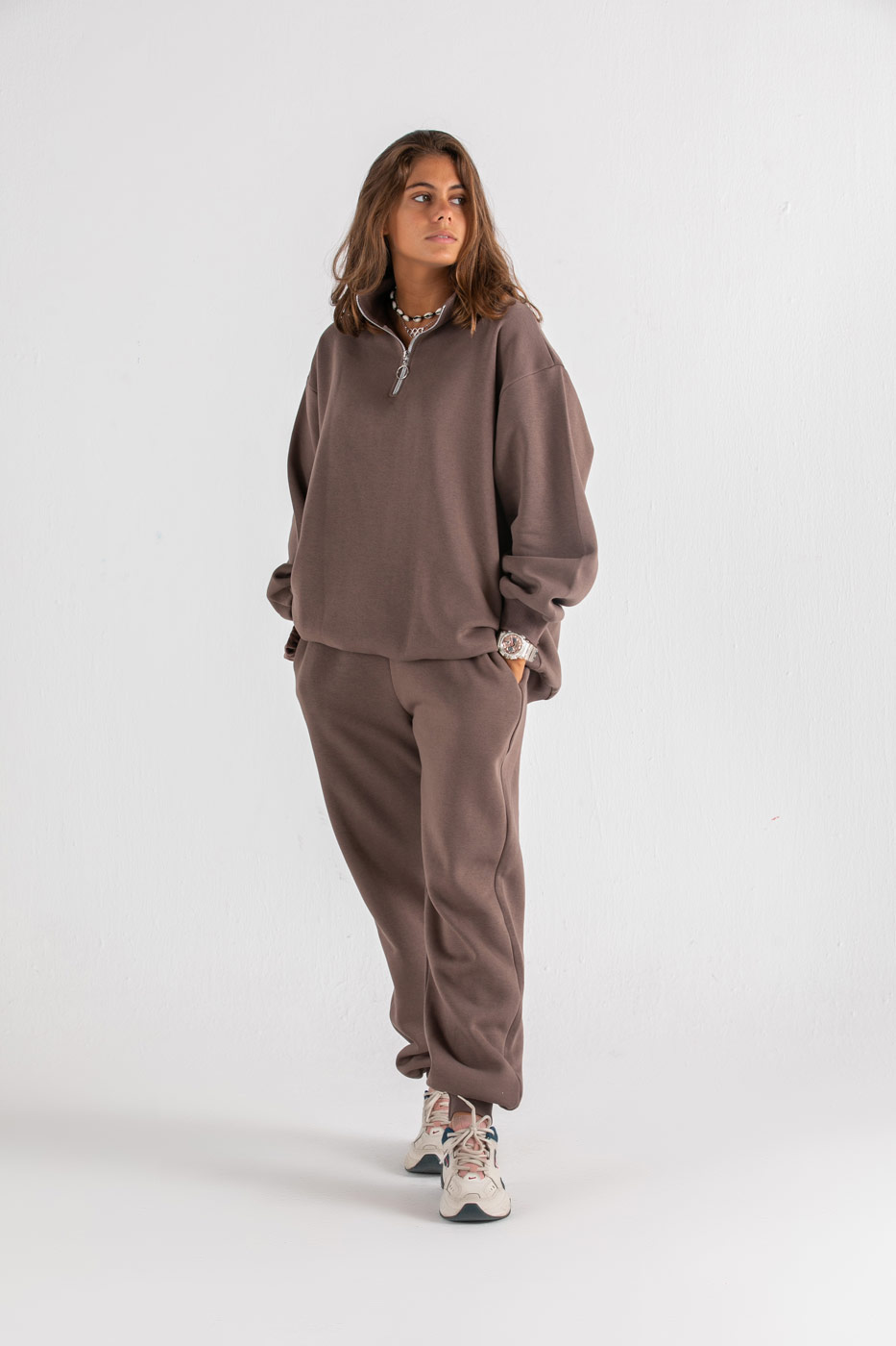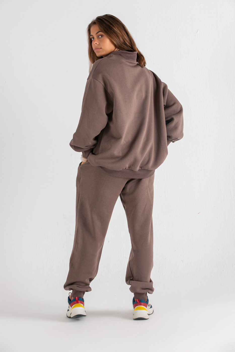 طقم قطعتين من سويت شيرت بعنق دائرى و أكمام طويلة مع بنطلون بخصر و حواف مرنة.