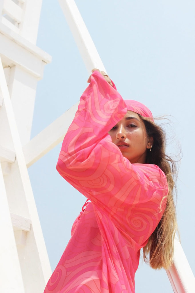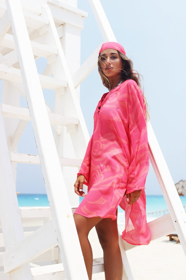 Nothing screams summer vibes like our soft chiffon pink waves dress coverup matched with it's very square headscarf to complete the look!Size Details