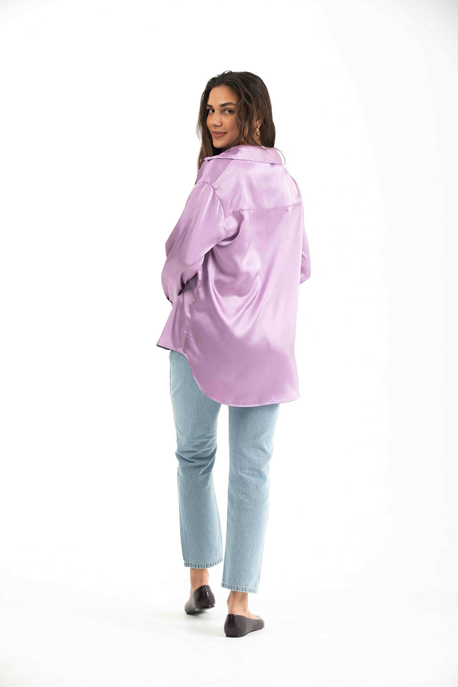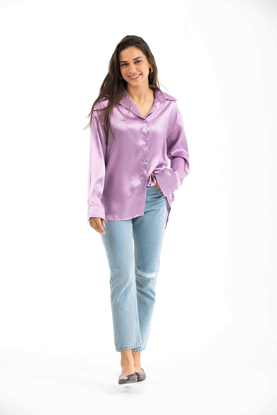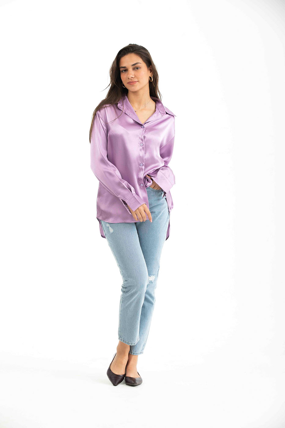Purple Buttoned Long Sleeved Satin Shirt