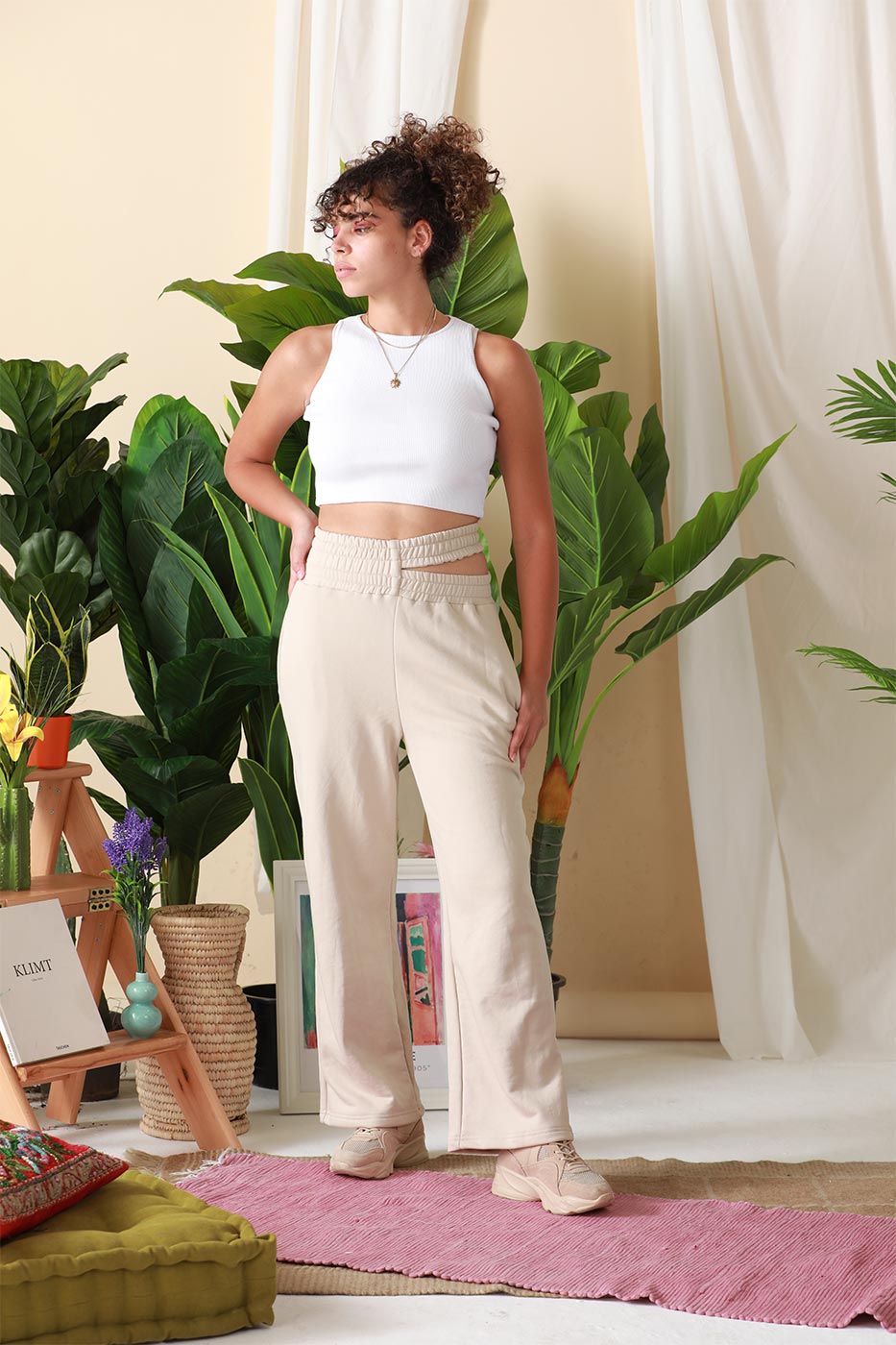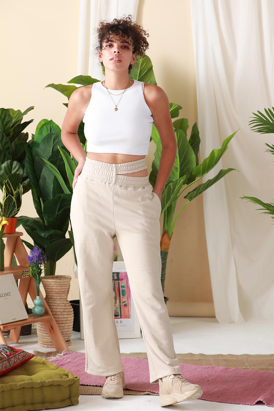 Keep all eyes on you with our ' Slashed In Style ' pants. This mid-rise pants features an elasticated waist with a cut-out detail, overall plain design and straight cut leg design. Style it with your basic white top and sneakers to be in style!Size Details