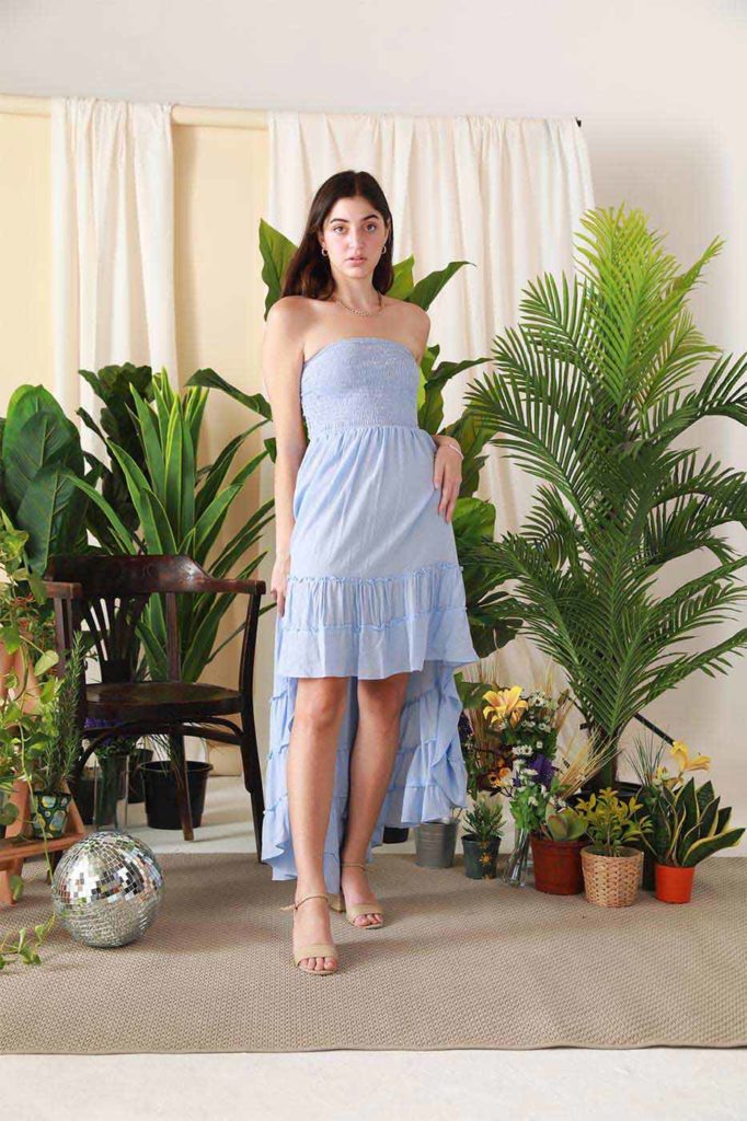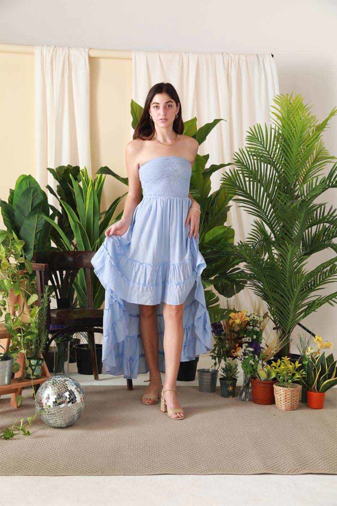 Summer parties are just around the corner and we got your back with our ' Tango Me ' dress. This strapless dress features a shirred-stretch bodice, ruffle detail , open back with straps and a high-low hem. Put your strappy sandals on and you are ready to dance in style.Size Details