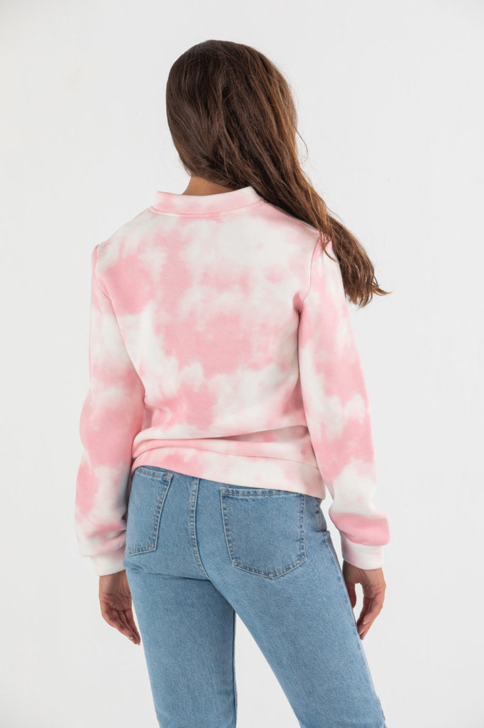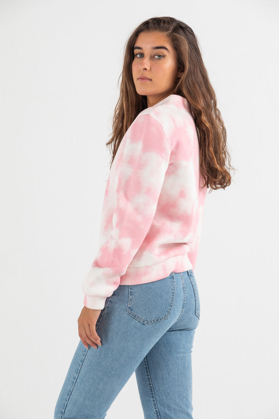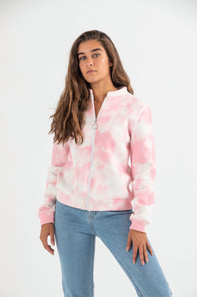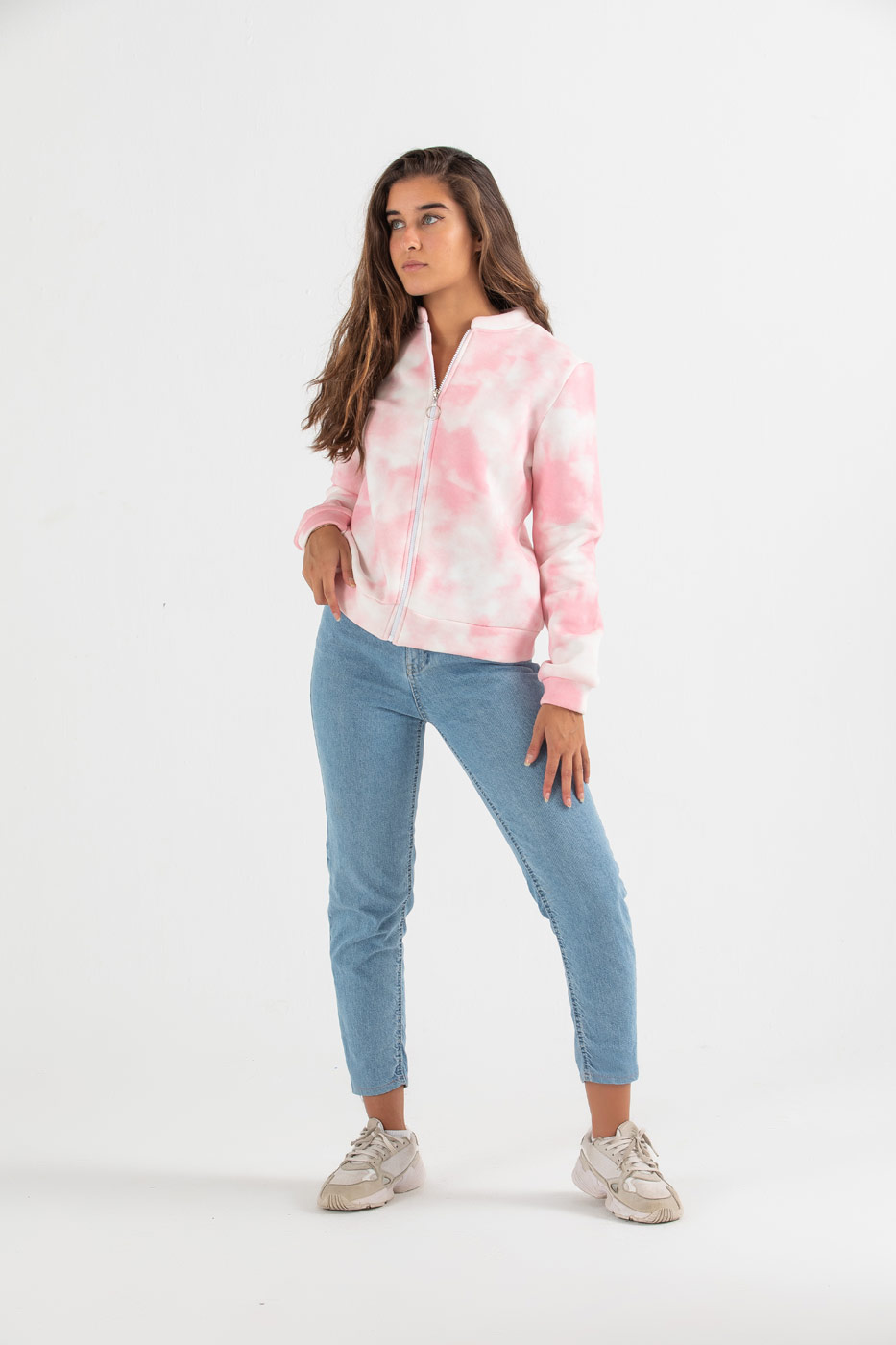 Leave an impact this fall in our ' Pink Tie Dye ' jacket. This jacket is fabricated from heavy cotton and features a front zip, overall tie dye design and ribbed trims. Style it with your favorite pair of denim and you are ready to go! The tie dye print is randomly scattered and differs from one peice to another.Size Details