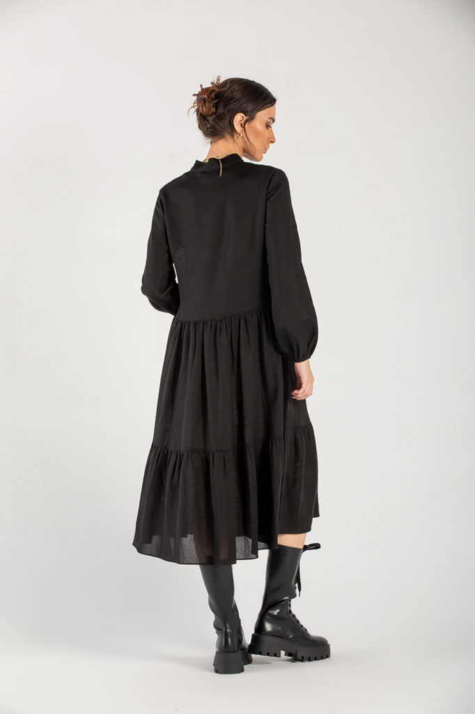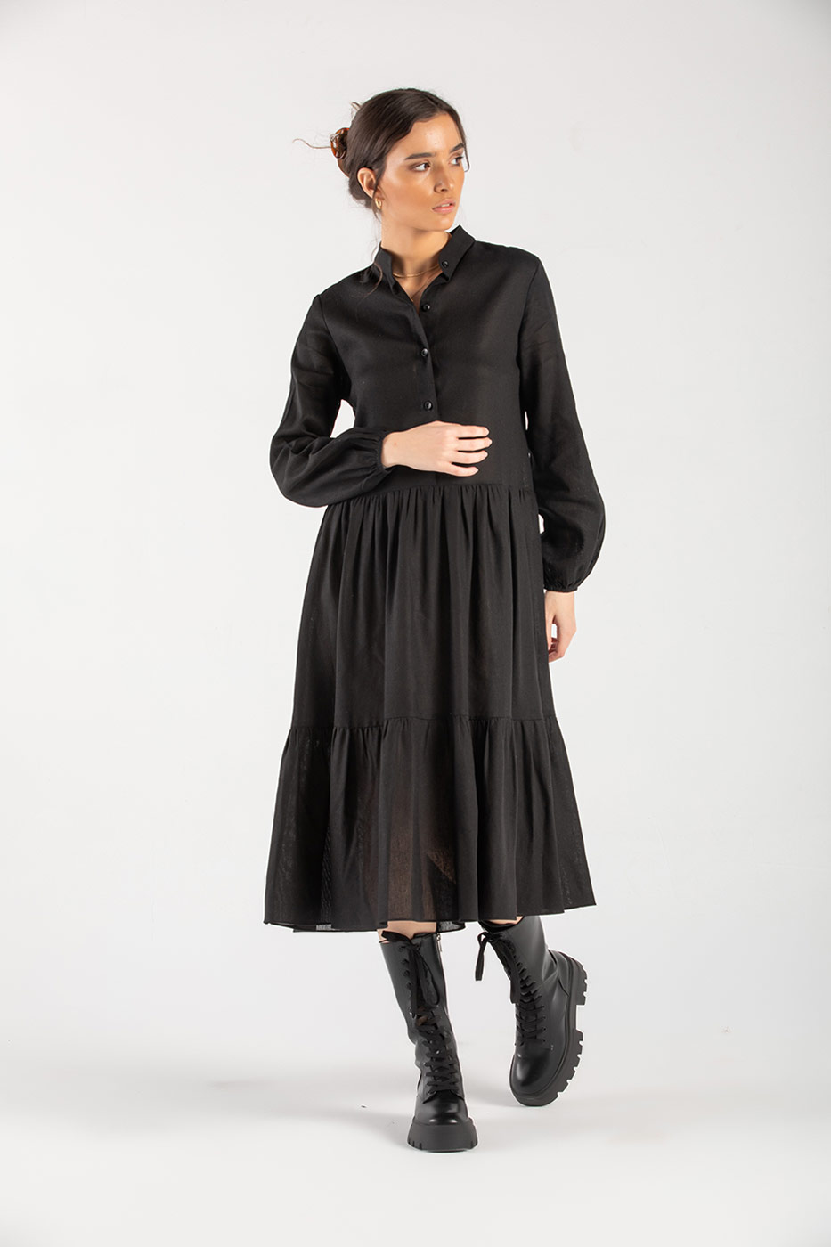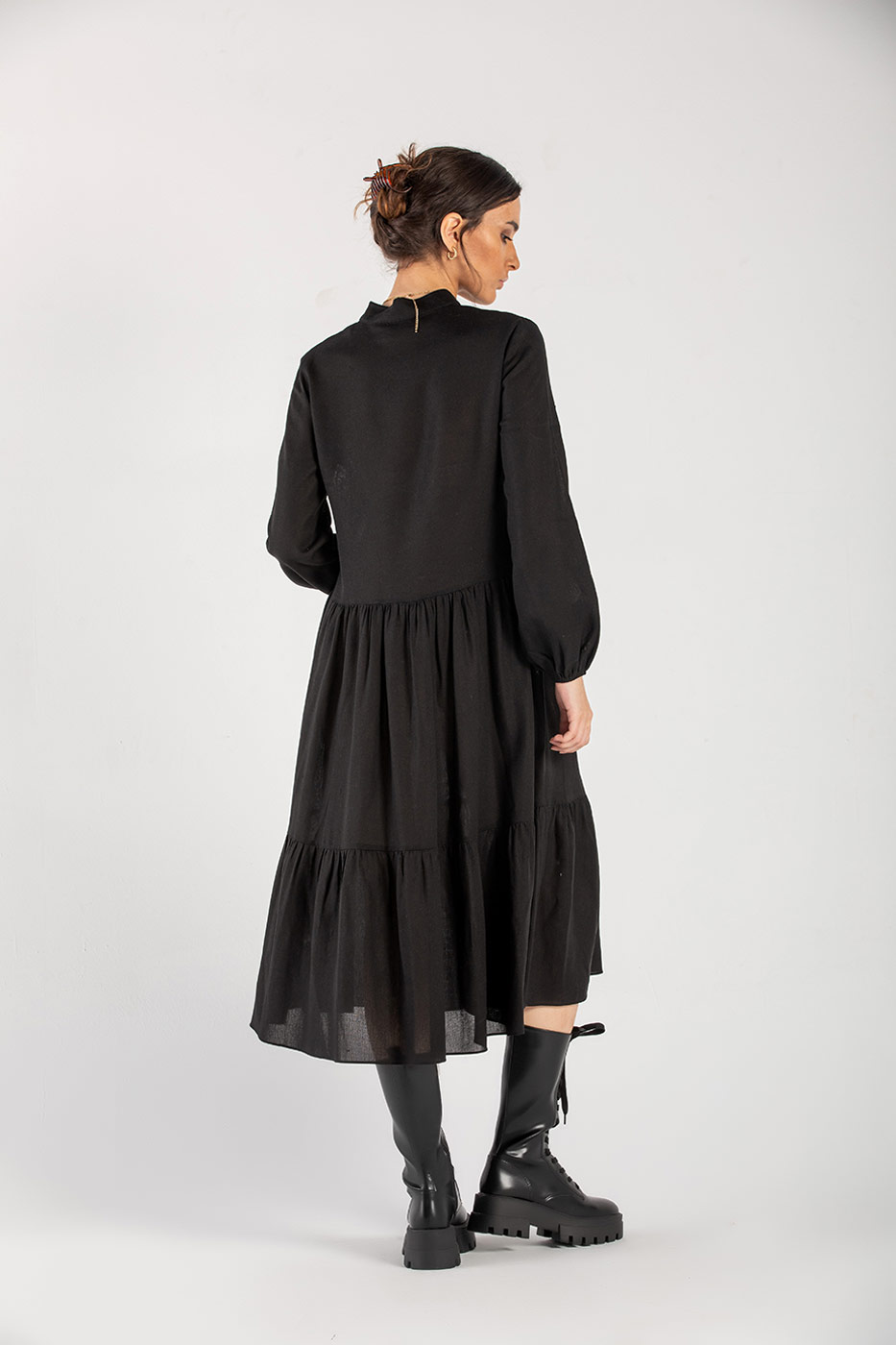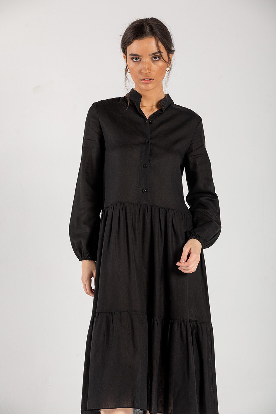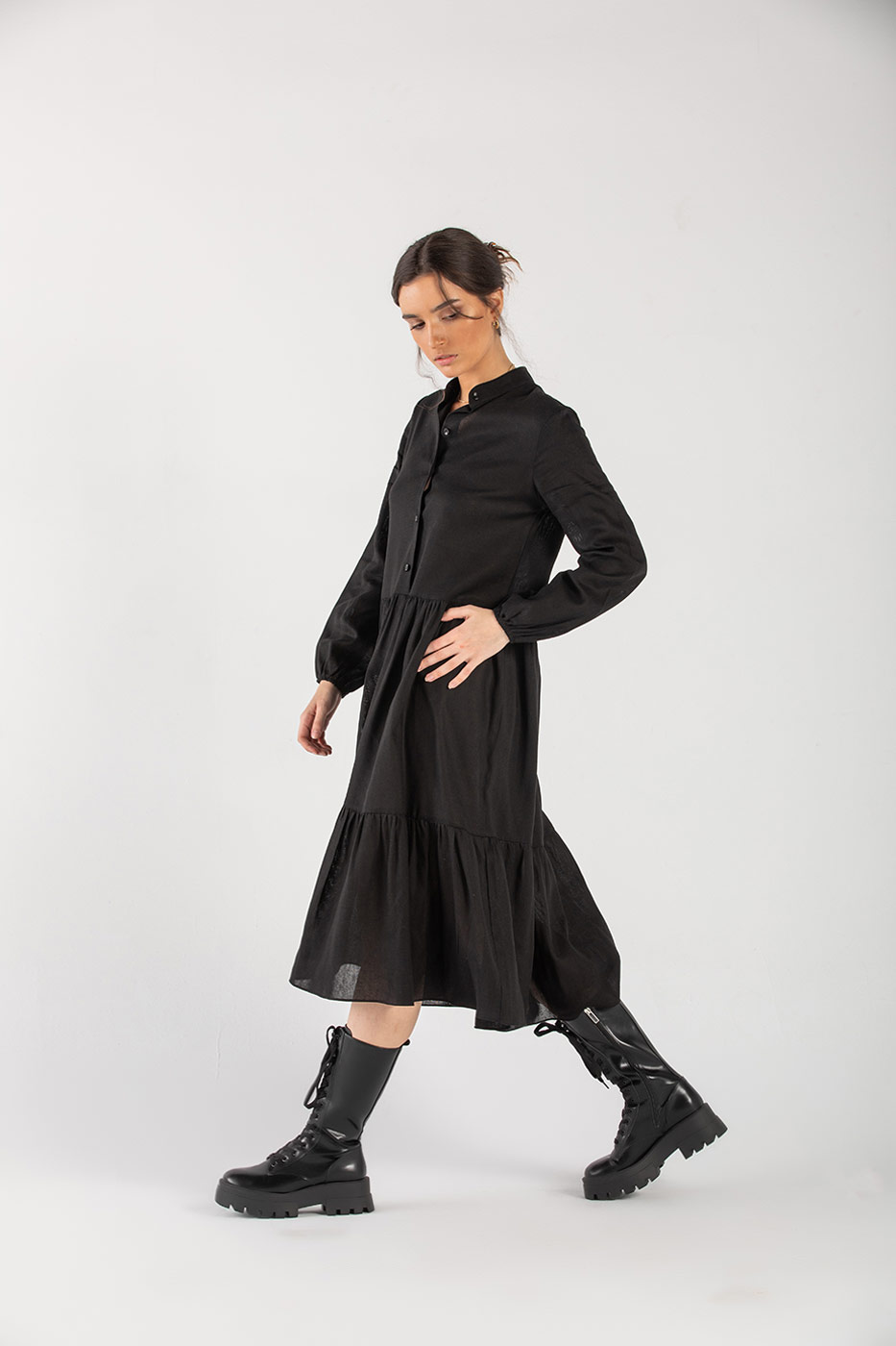 Stay casual and comfy in this black dress. This linen dress features an overall plain design, mock neck, button-down detail, long sleeves with elasticated cuffs, and a peplum hem. Just put your favorite boots on and you are ready to go!Size Details