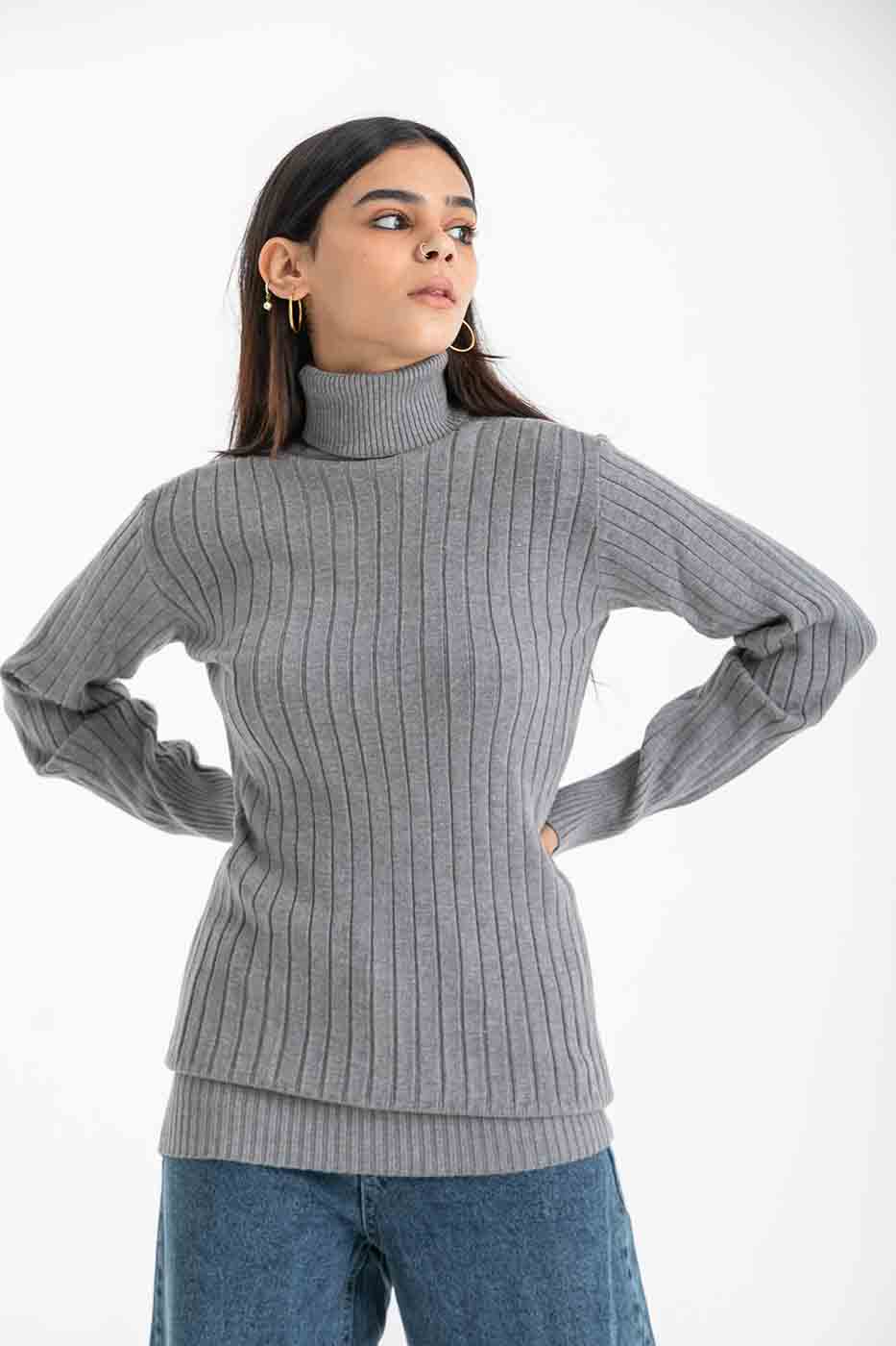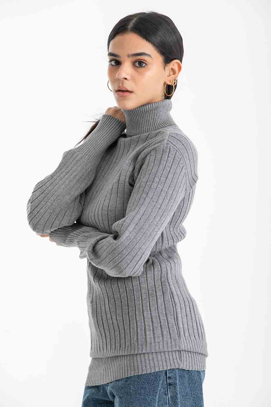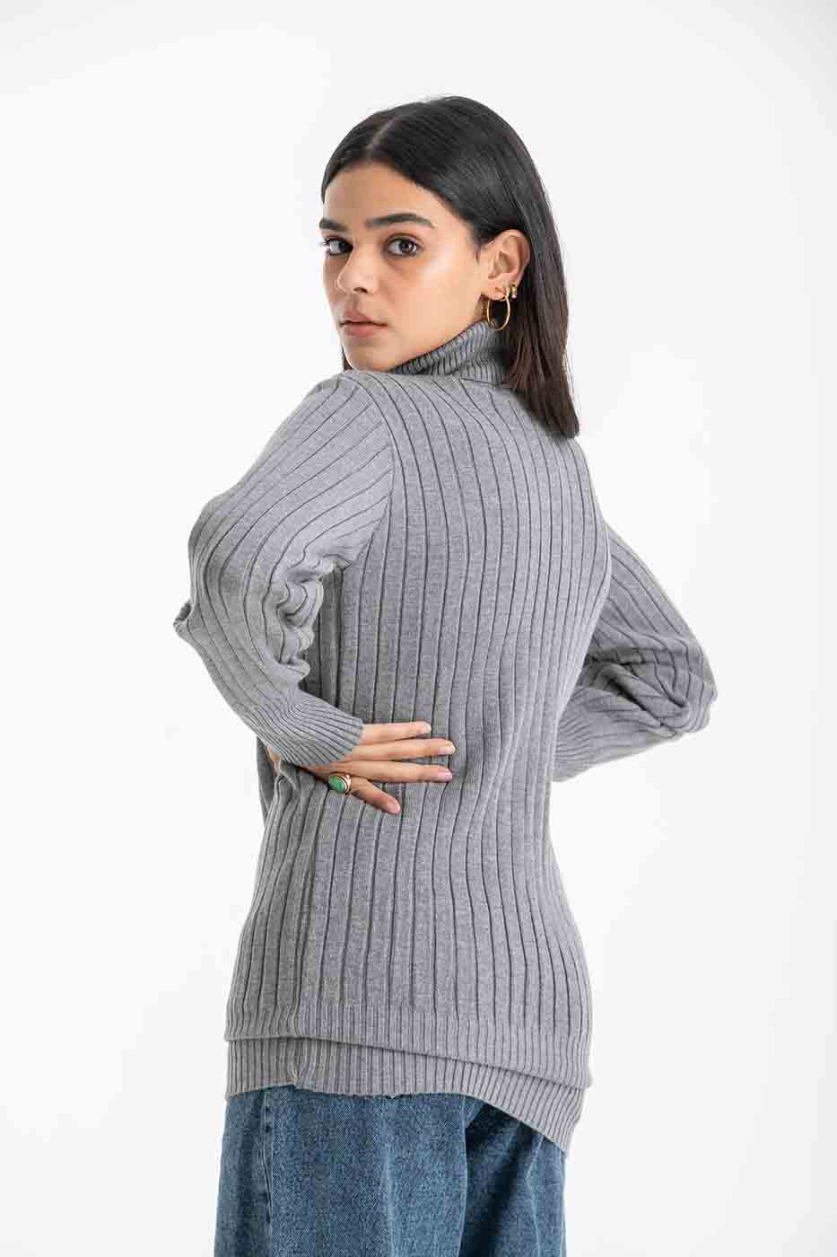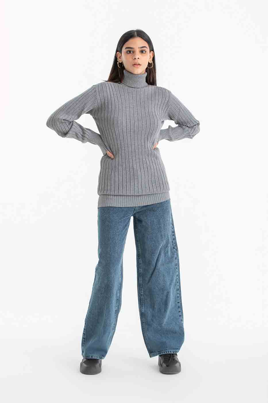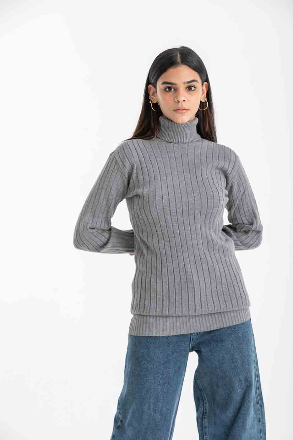 بلوزة مضلعة بقصة مستقيمة مع أكمام طويلة وقبة عالية