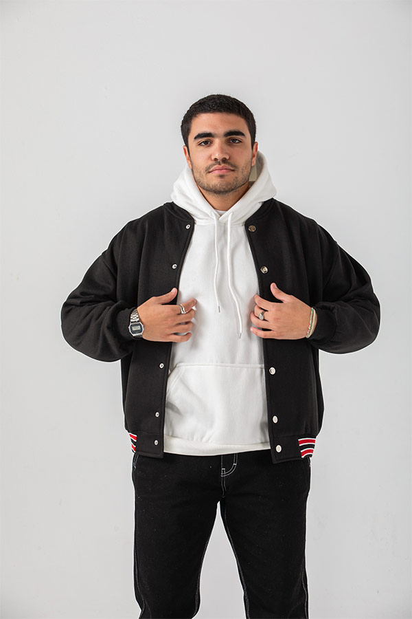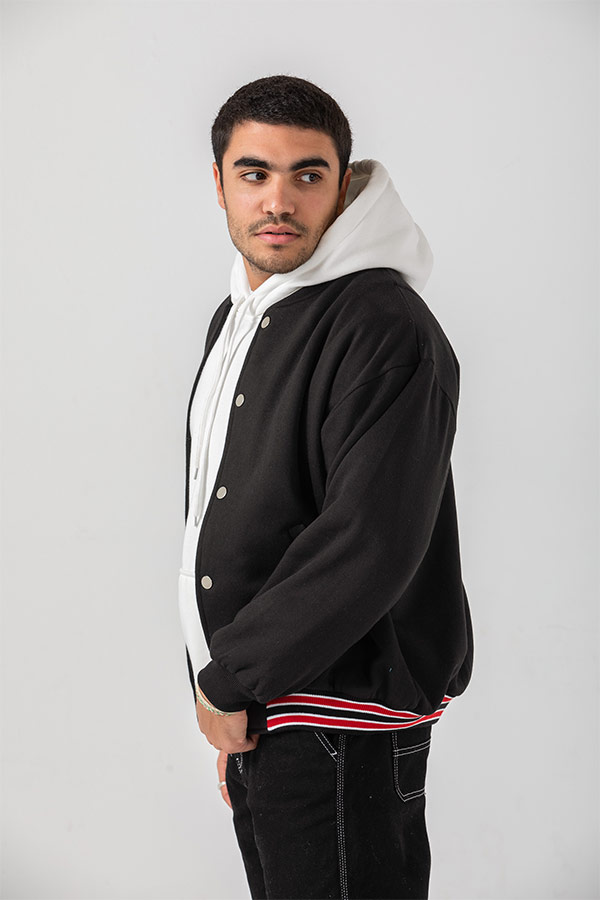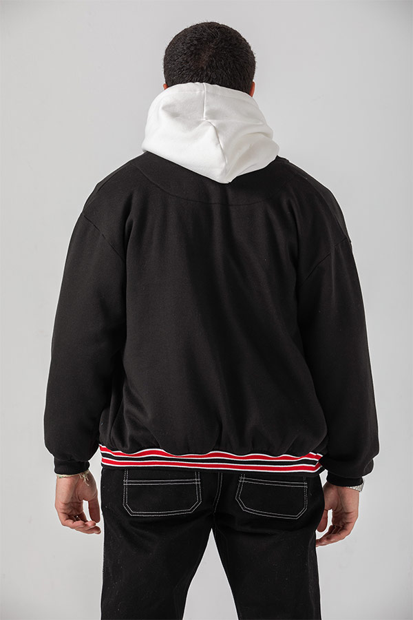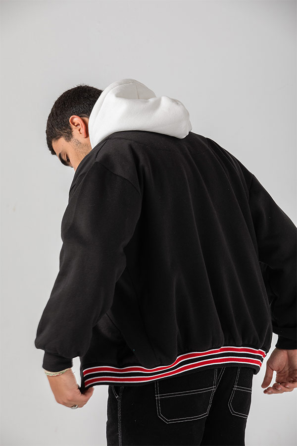 Fitted Black Varsity Jacket with Red Details, soft Milton interior and Waterproof Exterior, perfect for rocking your street style, even on rainy days!Size Details
